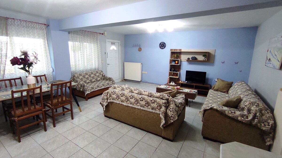 Un apartamento espacioso (55 metros cuadrados), limpio, luminoso y fresco en la planta baja con un hermoso jardín. Se encuentra justo al lado de un centro deportivo público con parque infantil, y la popular playa de Kalamitsa está a solo 250 metros a pie. El centro de la ciudad (y el museo arqueológico) se encuentra a 2,5 km y se puede acceder fácilmente en transporte público (hay una parada de autobús a 100 metros de la casa). El sitio arqueológico de Philippi está a 14 km y el aeropuerto de Kavala a 35 km.