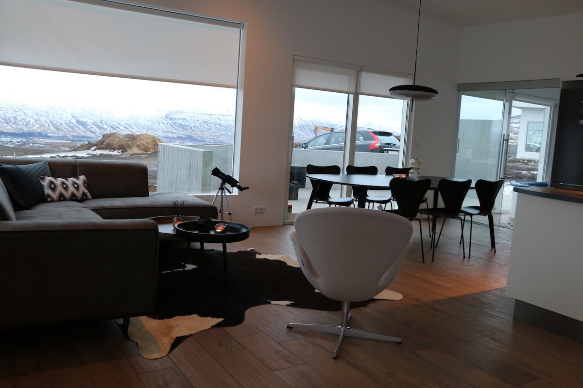 This privately owned cottage is located in the hill overviewing Akureyri, only few minutes from the town centre. Comfortable and elegantly designed with amazing view. In the midst of beautiful nature in summer. Northern lights in fall and winter.