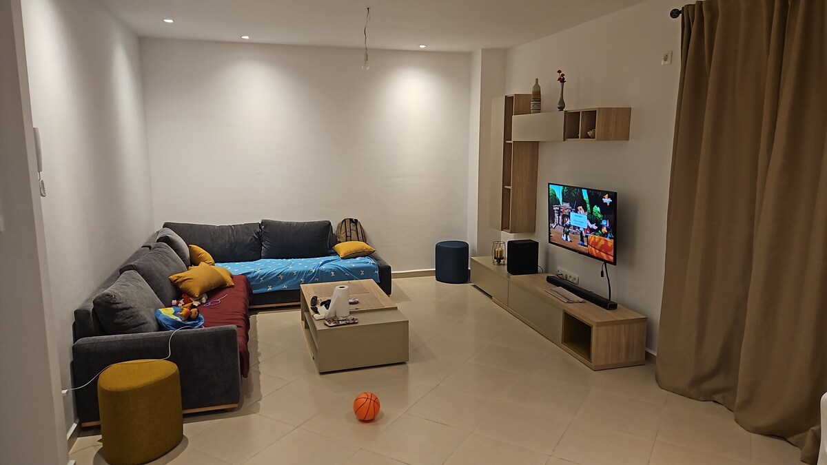 Apartamento muy amplio ,con vistas al mar desde la sala de estar,y a la montaña de chenoi desde la cocina, el apartamento está en el nivel del tercer piso en un edificio residencial , tiene una gran sala de estar, un dormitorio con una cama de matrimonio y otro dormitorio equipado con dos camas individuales, el barrio es muy tranquilo, plazas de aparcamiento disponibles en la parte inferior de la residencia.