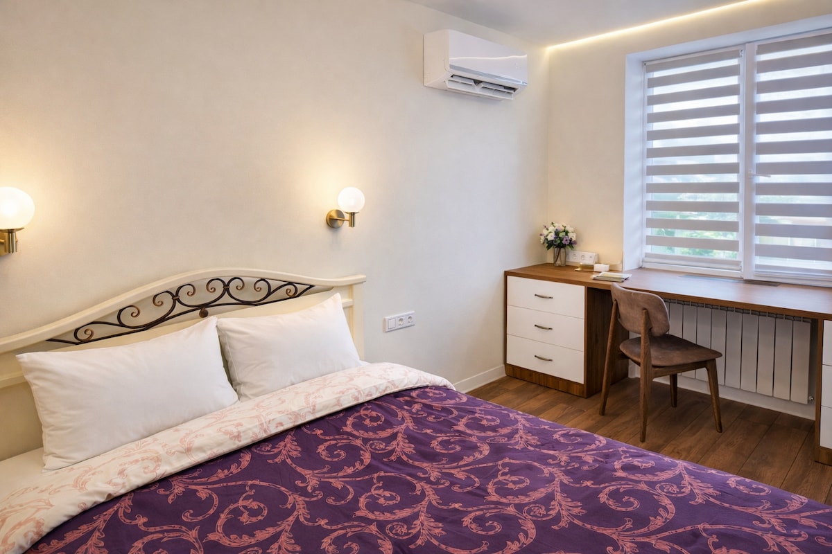 Стильная квартира 45 м² в самом центре Тирасполя — рядом Драмтеатр, бульвар Гагарина и парк. Планировка: 1 спальня + кухня-студия, комфортно до 3 гостей. В спальне двуспальная кровать, в студии большой раскладной диван. Современный санузел с отличной душевой, открытый балкон. Гардеробная, рабочая зона, быстрый Wi-Fi, ТВ и кондиционер. Кухня с раковиной с видом во двор. Стиралка с сушилкой, утюг и гладильная доска — всё для удобного проживания.