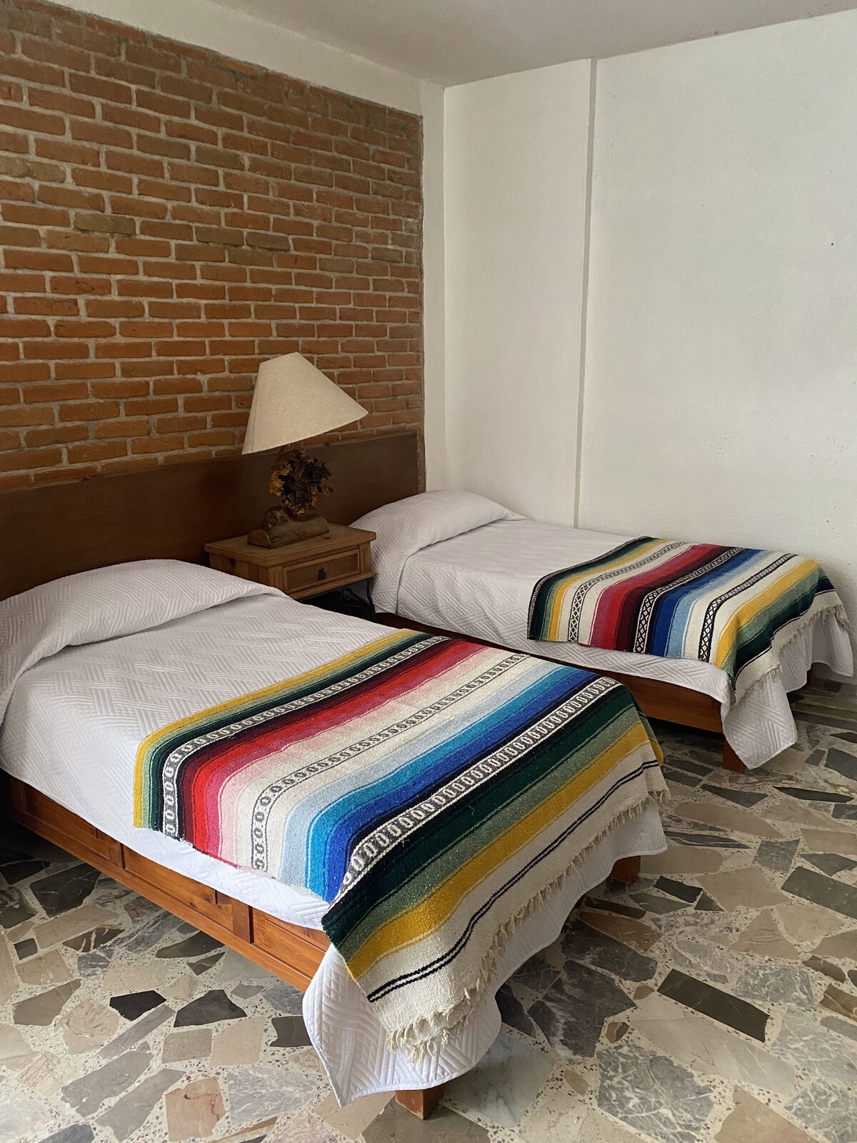 Es una habitación doble equipada como un departamento. En un estilo rústico acogedor con linda vista a nuestro Jardín :) Cuenta con : 2 camas individuales Armario Mesa con barriletes Cocina completa : parrilla, fregadero, refrigerador y microondas; con utensilios !! Baño completo (Regadera amplia ) Servicios: luz, gas , agua ( agua caliente 24/7), Internet Wifi Para un estancia cómoda y excelentemente ubicada !!!