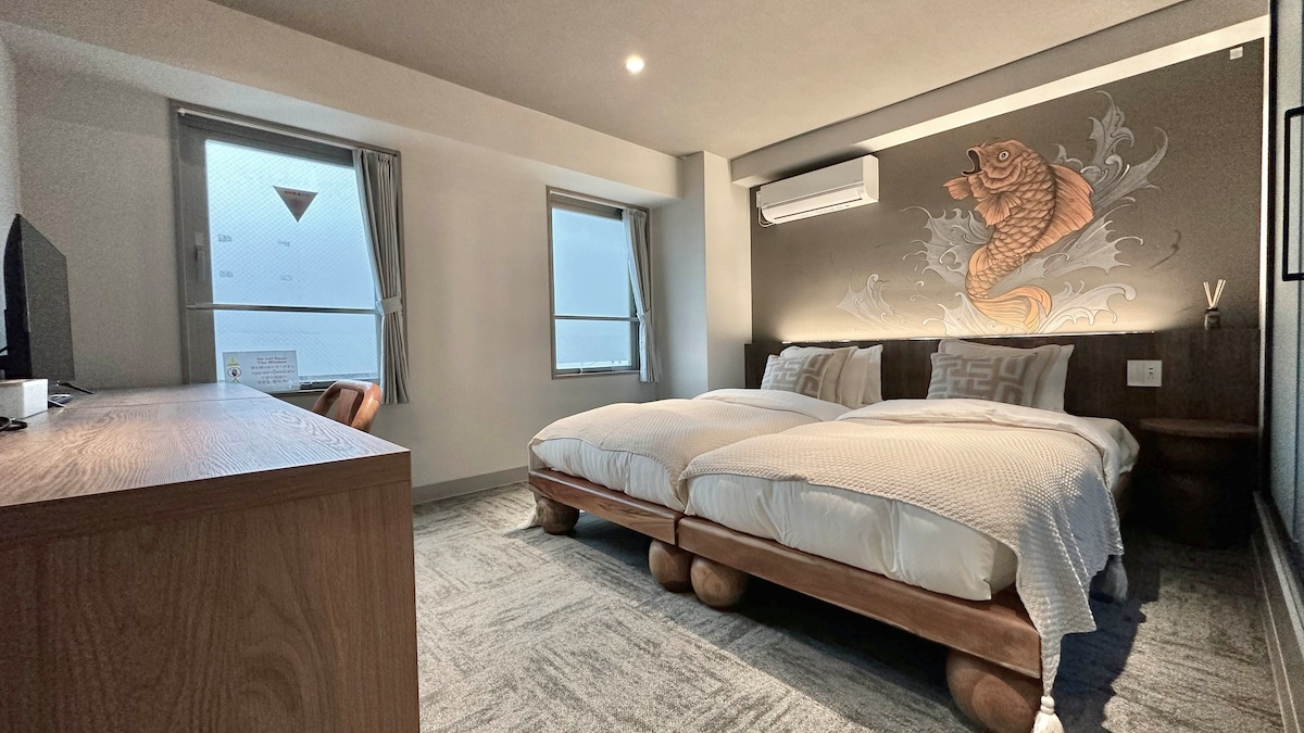 Recientemente construido pensando en los viajeros. Las habitaciones son espaciosas con camas tamaño queen (prácticamente inauditas en Japón). Smart TV, Wi-Fi, té y café. Los baños están de moda, con grandes duchas de lluvia. Espejos LED para prepararte para cualquier iluminación que te encuentres. Las habitaciones tienen una nevera bar, microondas y hervidor de agua para que pueda almacenar y preparar comidas y bebidas listas para usar. Todas las habitaciones están equipadas con aire acondicionado, ventiladores de techo y cortinas opacas. ¡Amplio espacio de almacenamiento también!