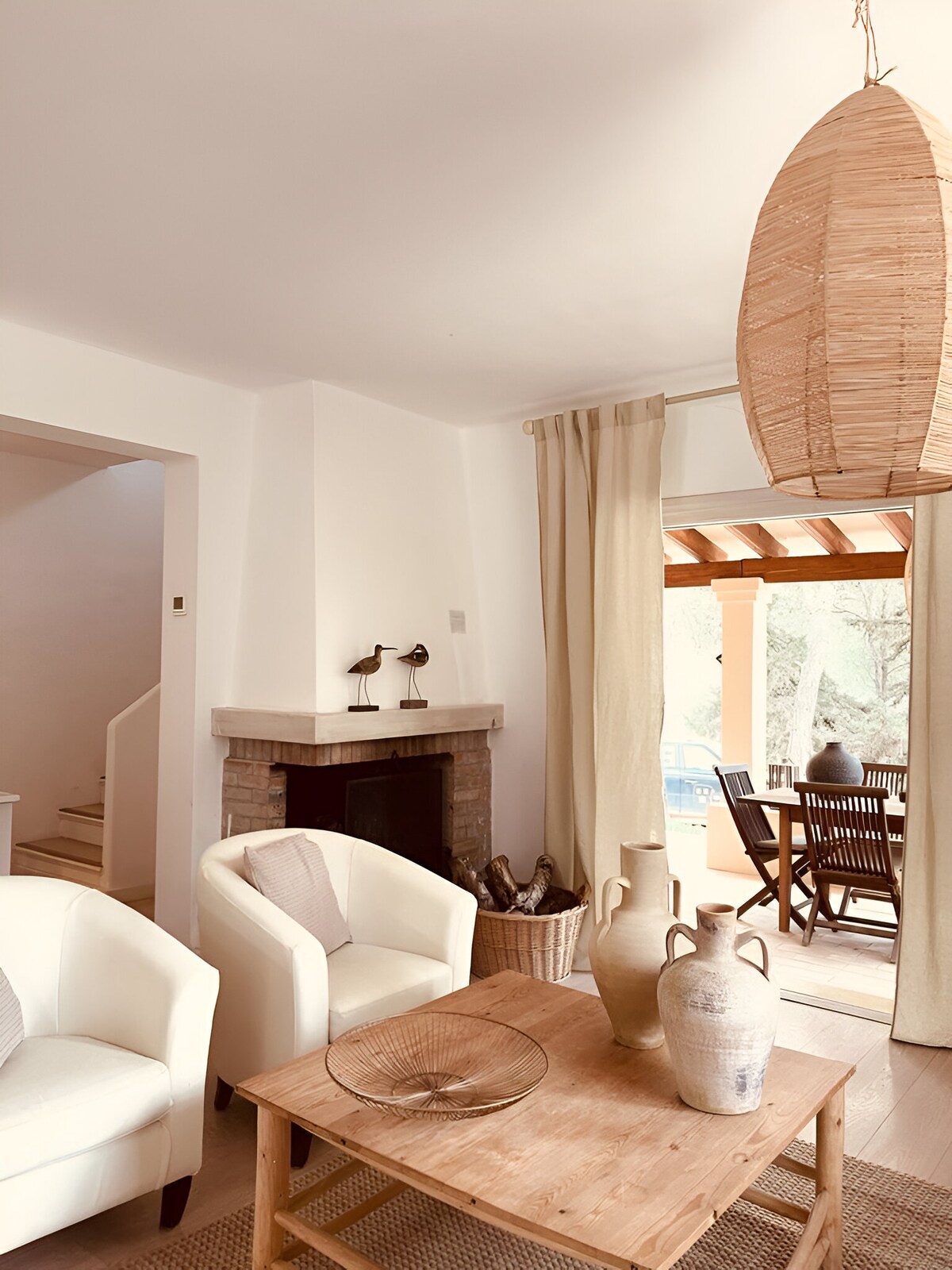 Hermosa villa recién renovada en una ubicación privilegiada, situada a solo 5 minutos a pie de la famosa Playa de Mitjorn, con 7 km de playa de arena blanca y calas con agua turquesa cristalina. La casa acaba de ser completamente reformada y totalmente equipada con Aire en cada habitacion. En una amplia terraza, hay una gran piscina de jacuzzi, perfecta para refrescarse, además de un área de comedor, tumbonas y ducha al aire libre. ¡A solo 3 minutos a pie de una playa de arena blanca!