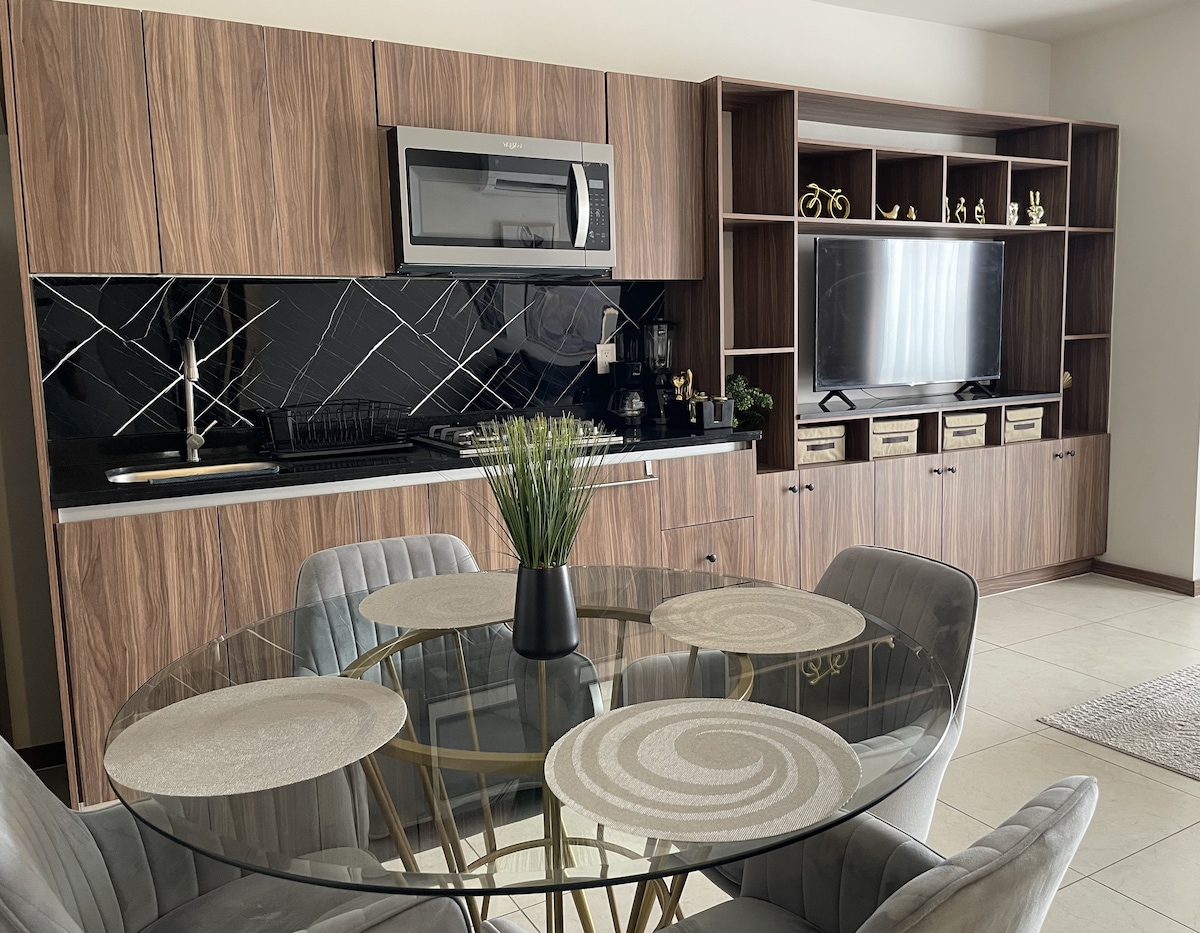 Elegante departamento de 2 recámaras en el cuarto piso con elevador, ubicado en exclusiva zona residencial. Cuenta con cocina equipada, sala y comedor amplios, estacionamiento gratuito y amenidades como alberca, gimnasio y salón de estar. A pasos de malls, bancos, restaurantes y tiendas. Con acceso rápido al aeropuerto por vía principal. Ideal para familias o viajes de negocios que buscan comodidad, ubicación y estilo.