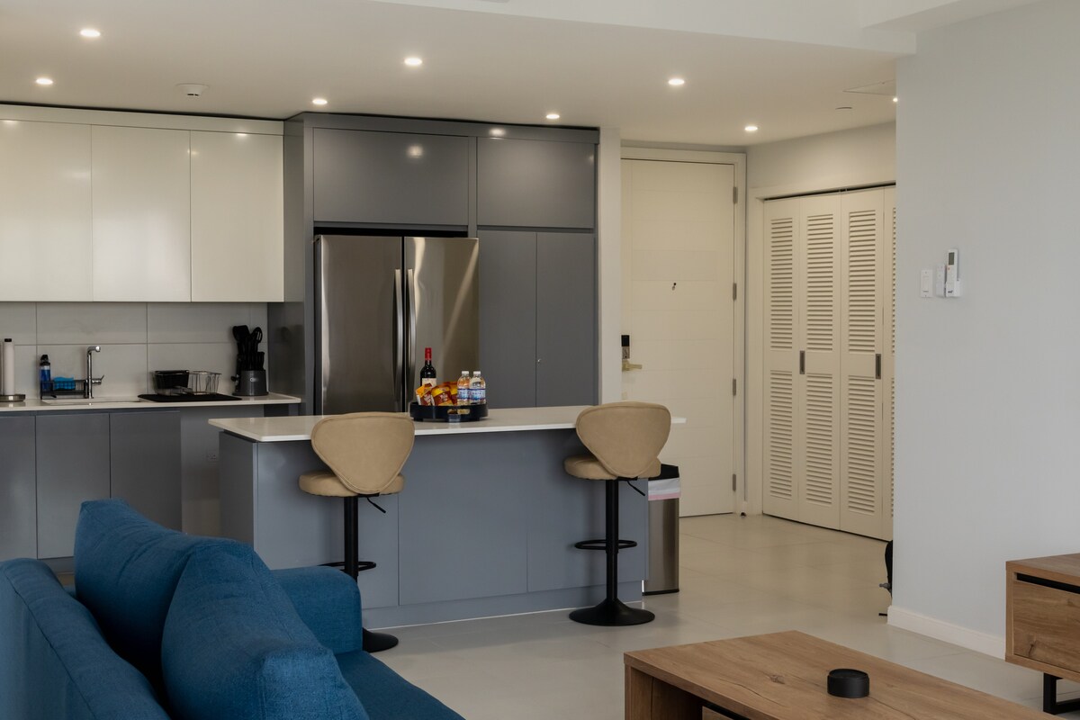 Apartamento con vistas al mar ARRIBA, 4 dormitorios, 4 baños (en suite), con entrada privada. Cocina privada completa y sala de estar. Piscina pequeña compartida en la azotea, bar en el cenador, tumbonas. Con mucho personal, con muchos servicios gratuitos y de pago disponibles para los huéspedes, incluido wifi gratuito. El apartamento está en el segundo piso y requiere subir escaleras. La piscina en la azotea/cenador también requiere subir escaleras. Generador de respaldo.