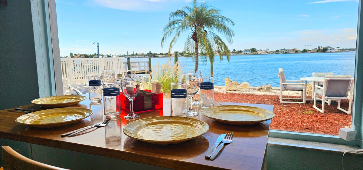 - Frente al mar estilo resort. - Independiente. - Jacuzzi. - Vistas al amanecer/atardecer en el muelle. - Kayaks gratuitos. - Internet/cable de YouTube. - Televisor inteligente de 65 pulgadas. - Amplio dormitorio con cama tamaño king, vestidor y TV de pantalla plana. - Lavadora y secadora en el alojamiento. - Espacio de trabajo designado. - Se admiten mascotas. - Patio privado vallado. - Aparcamiento gratuito para 2 coches/barcos. - Ubicación céntrica (playas, restaurantes, Tampa, St. Pete's, Safety Harbor, Dunedin). - A 11 minutos de la sala de eventos Ruth Eckerd. - Limpieza impecable. - Zona de café. - Comedor.