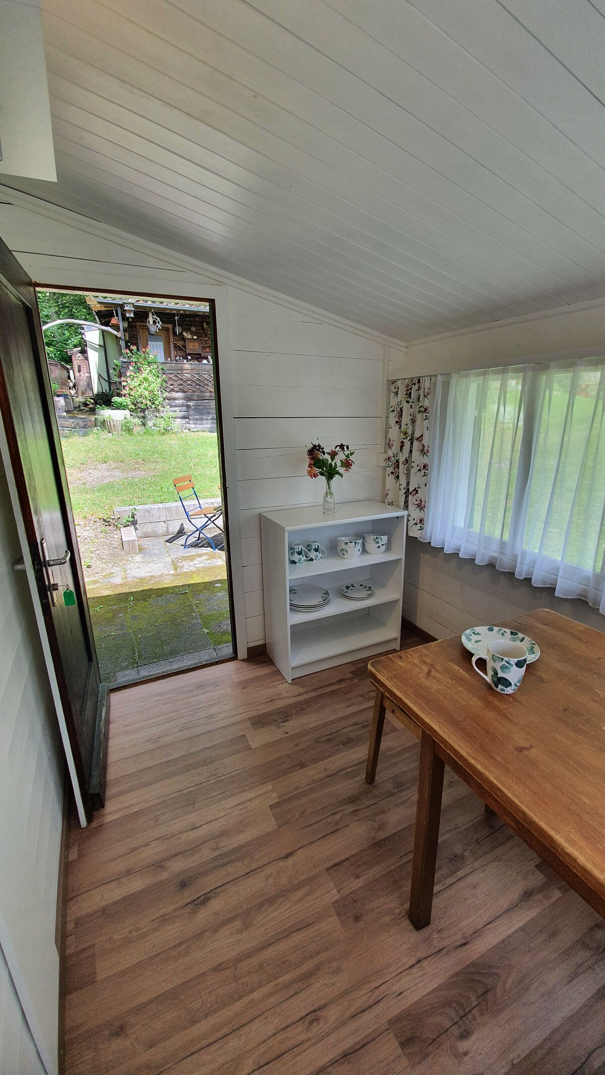 Pequeño bungalow romántico para un máximo de dos personas en medio del campo. El bungalow está situado en el borde del bosque en un camping. Está rodeada de hermosa naturaleza y un panorama de montaña. Equipado con una pequeña cama doble, sala de estar, platos de desayuno y una terraza, el bungaló ofrece todo lo que necesita, pero sin lujos. No hay baño ni aseo en el bungaló. Se pueden utilizar las instalaciones sanitarias del camping en las inmediaciones.