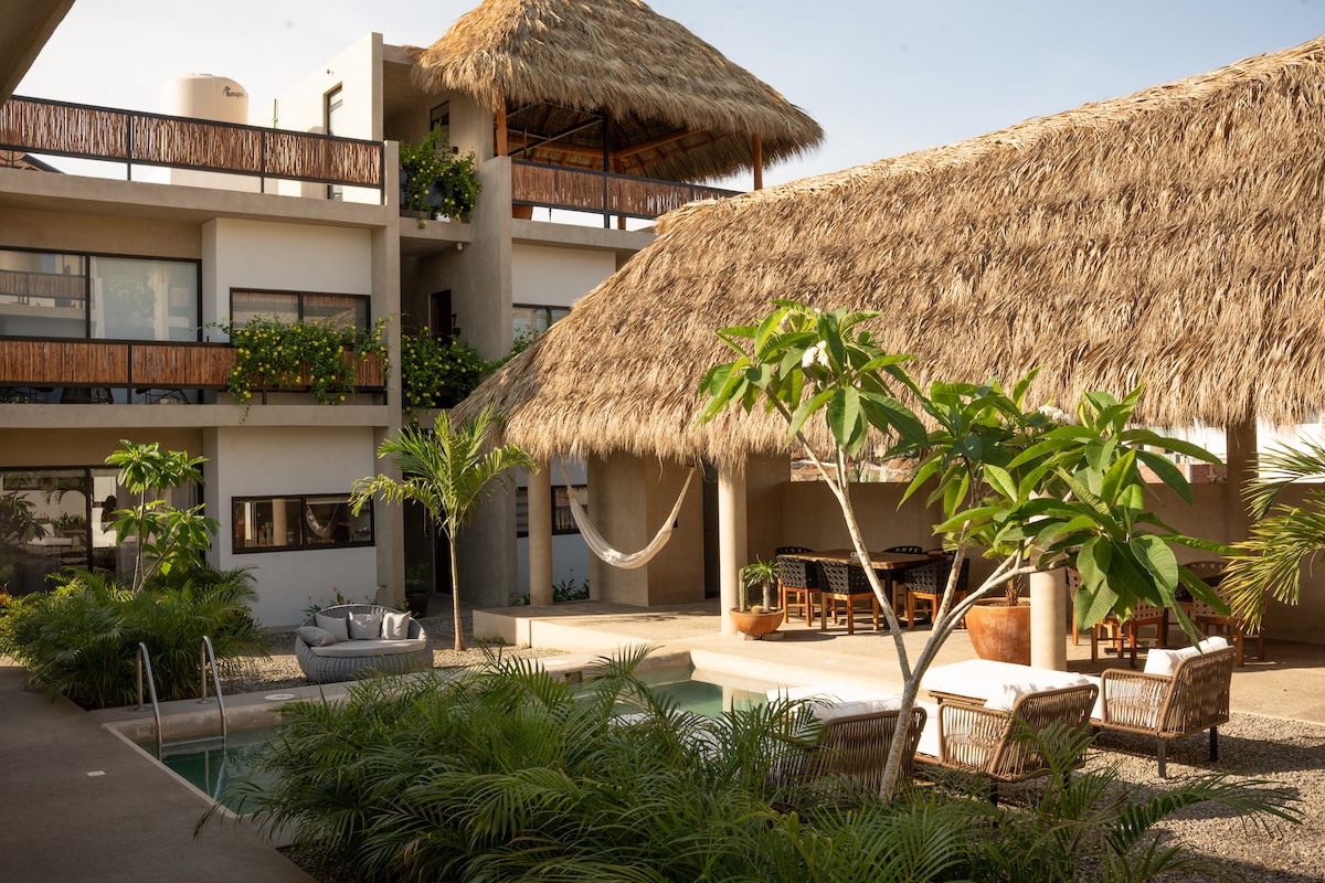 Auténtica casa mexicana de nueva construcción ubicada a 3 minutos a pie de la playa y a 1 minuto a pie de tiendas locales, restaurantes mexicanos e internacionales. Muy cerca hay varios lugares para practicar surf, ciclismo de montaña, rutas de senderismo e instalaciones de yoga. Nuestra casa tiene 3 dormitorios, 3 baños y 2 cocinas totalmente equipadas. Nuestro lote totalmente ajardinado incluye una piscina privada, zonas de estar interiores y exteriores, hamacas y tumbonas. Agua caliente y ventiladores de techo en toda la casa.
