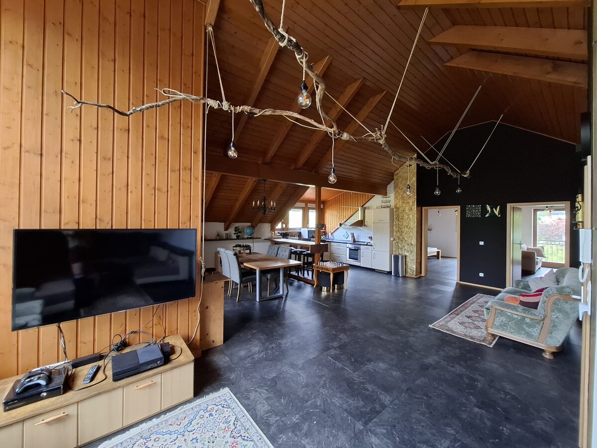 Bienvenido a nuestra casa de vacaciones de gestión familiar, Luxury Chalet Lore, en el complejo oficialmente reconocido de Fuchsmühl en las montañas Fichtel (Baviera). Deja atrás tu vida cotidiana y disfruta de la agradable tranquilidad, el aroma de la madera, la suave luz y la chimenea crepitante. O relájate en el gimnasio privado, la sauna de infrarrojos o el jacuzzi del jardín. La zona exterior aún está en construcción, por lo que se aplica un precio especial por el momento.