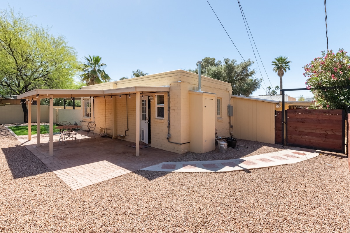 Este encantador estudio con un colchón nuevo está preparado para estancias largas y cortas: --Internet rápido y escritorio de trabajo exclusivo --Armario y cómoda para tus cosas --Entrada privada y aparcamiento dedicado fuera de tu puerta --4 minutos a pie de Whole Foods -- En el centro de Tucson, cerca de la universidad, los hospitales, el centro de la ciudad y casi todo lo demás. -- Totalmente amueblado con microondas, olla, arrocera, ollas, licuadora, horno tostador y todo lo demás que necesites. - ¡Patio completamente vallado, los perros son bienvenidos!