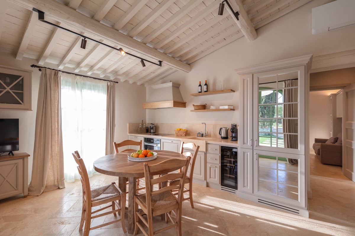 Villetta intima e indipendente completamente nuova e ristrutturata con ampio giardino privato all'interno del Boutique Resort Terre dei Ghelfi. Zona giorno luminosa con travi a vista, cucina attrezzata e salotto accogliente; camera matrimoniale e bagno con ampia doccia. All’esterno, portico arredato e giardino privato con sdraio e ombrellone. Aria condizionata, riscaldamento a pavimento, elettrodomestici Miele, biancheria di alta qualità e accesso alla piscina riscaldata.
