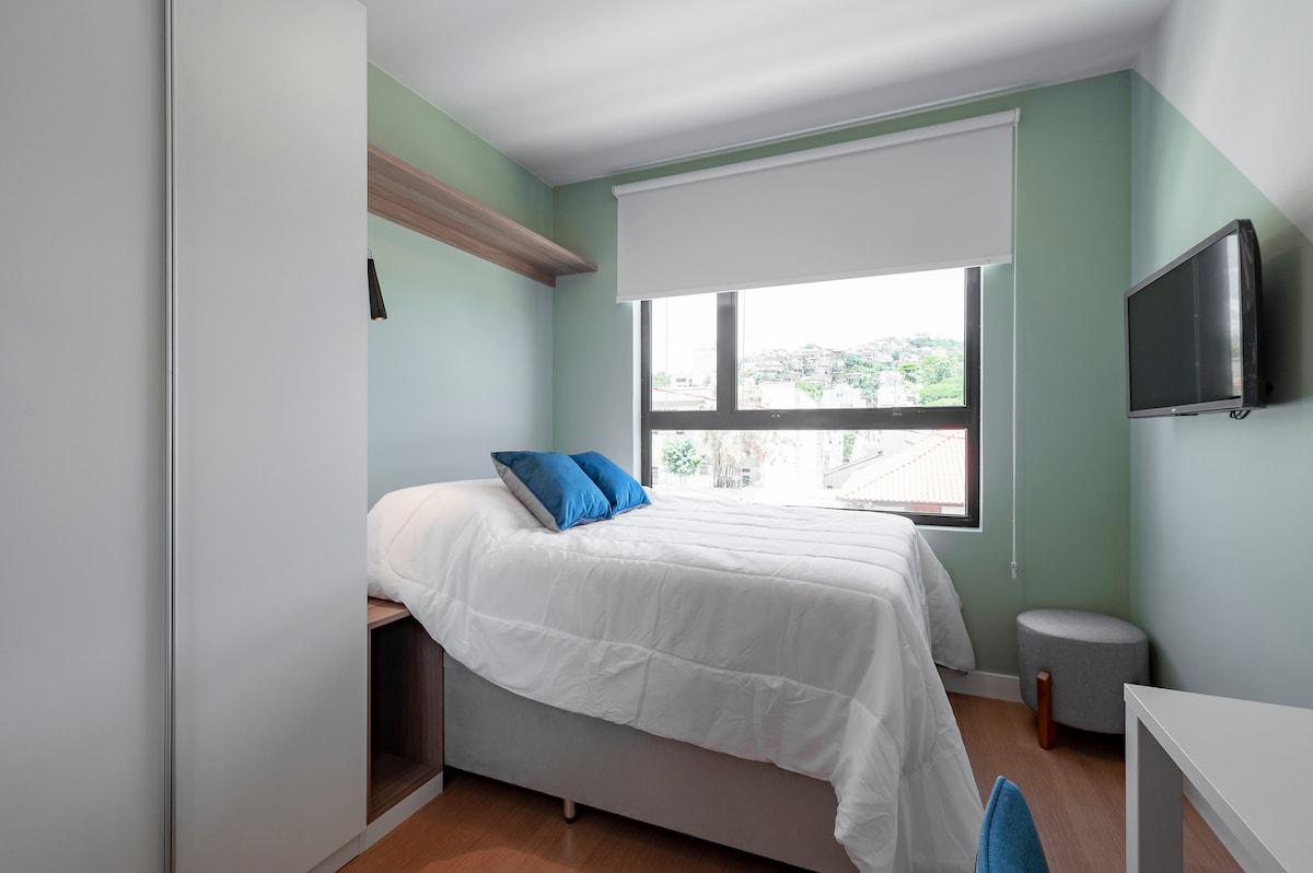 Estudio moderno de 30 m² de estilo industrial, ideal para trabajar o estudiar. Cuenta con rincón de lectura, cocina equipada (cocina de inducción), Smart TV 43”, Wi-Fi de 200 megas (fibra óptica), aire acondicionado de 12.000 BTU y dos camas individuales que se pueden unir. Lugar tranquilo, seguro y con plaza cubierta. A menos de 100 metros hay panadería, farmacia, mercado, bares y lugares para caminar. Cerca de la UFSC, UDESC y UniSociesc. ¡Ideal para una estancia práctica y cómoda!