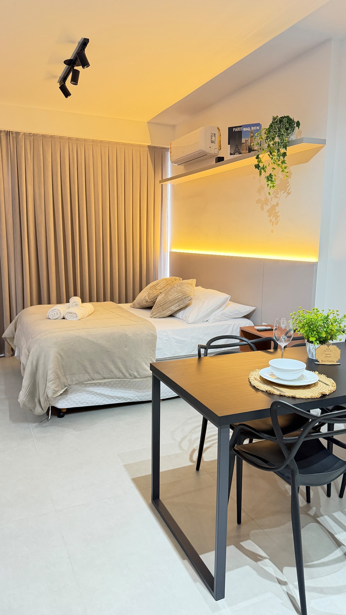 Estudio moderno y completo en Viva Trindade, una de las ubicaciones más estratégicas de Florianópolis. Delante de la UFSC. Junto al centro comercial Vila Romana. Supermercado Angeloni en la planta baja del edificio. Cafés y restaurantes en el propio condominio. Ideal para quienes buscan practicidad, sin necesidad de un automóvil. El estudio ofrece: Cómoda cama matrimonial Wi-Fi Televisión inteligente Sala de máquinas Lavandería en el edificio Lugar para mascotas. Reserva y disfruta de la experiencia de alojarte en uno de los lugares más completos de Trindade.