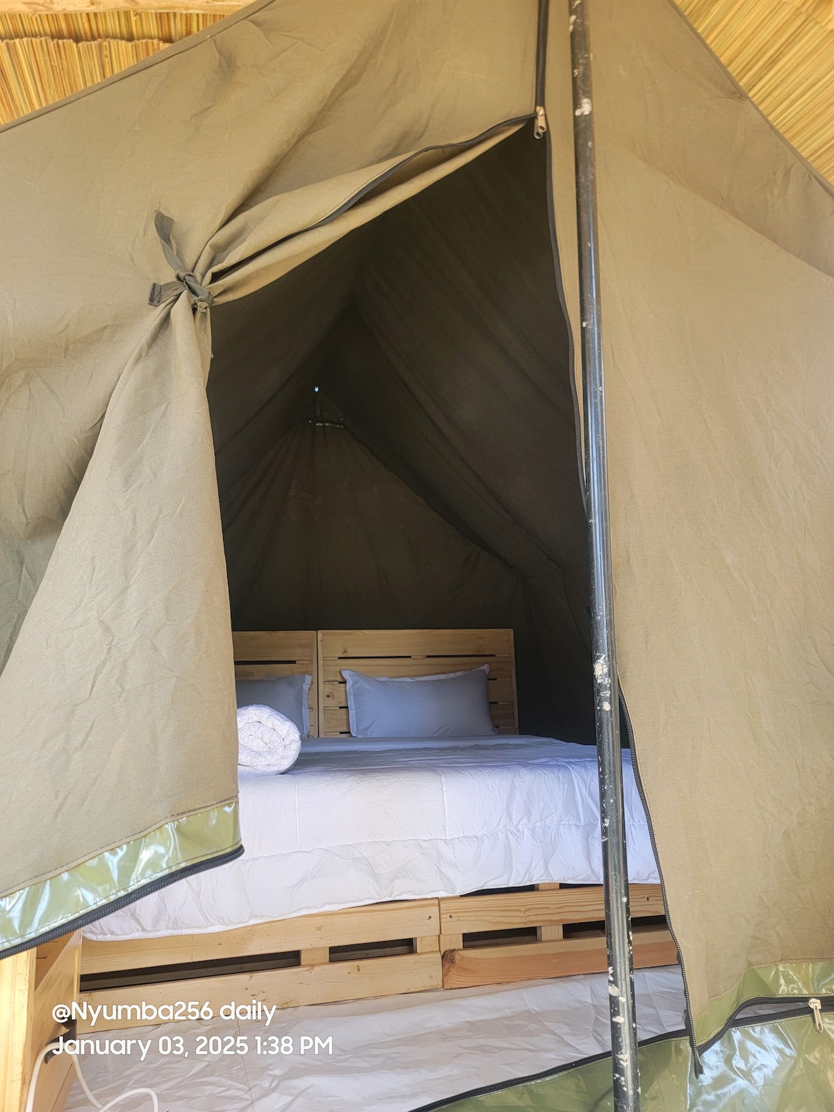 La tienda Roots ofrece una escapada tranquila a la naturaleza con la opción de dos camas individuales o una cama tamaño king. Ideal para viajeros solos o parejas que buscan sencillez y comodidad cerca de Gulu. Disfruta de noches compartidas alrededor de una fogata, comidas locales, paseos en bicicleta, servicios de masajes y planificación de excursiones en el acogedor Nyumba256 Village.
