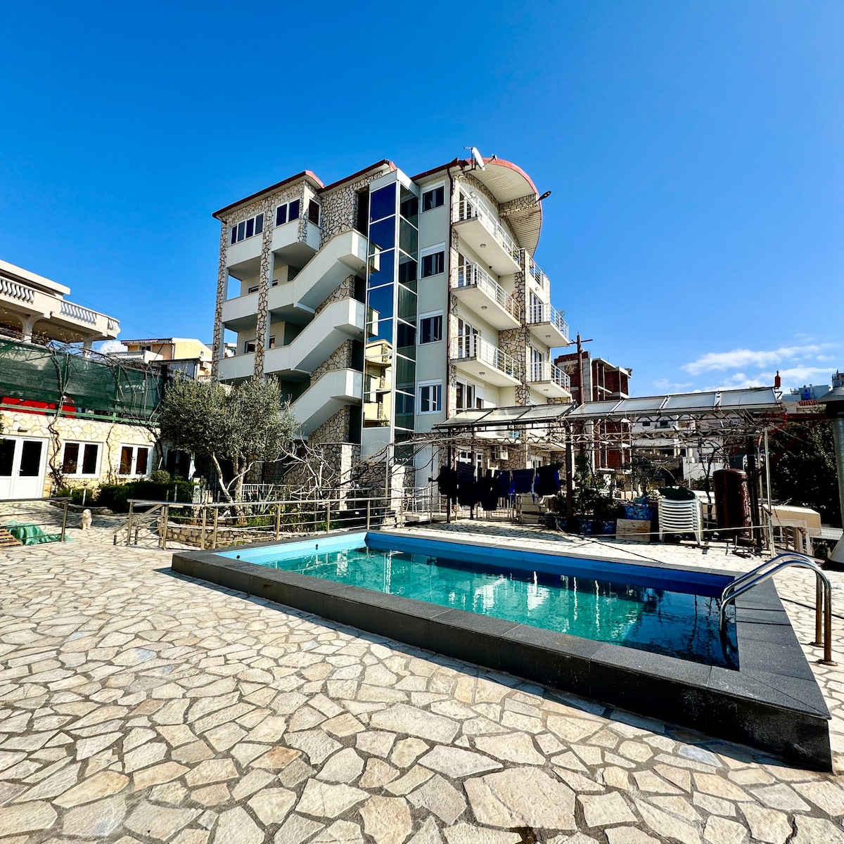 Welcome to Tati Apartments a family-run residence with over 20 years of hosting experience. Our property features 9 fully equipped apartments, each with kitchenette and bathroom and WIFI, perfect for a comfortable and independent stay. Guests can enjoy a shared pool, jacuzzi, sauna, and a rooftop terrace with beautiful city views. Breakfast and dinner are available in our on-site dining area, and parking space. Located just 7 minutes walking distance downhill from the Small Beach and Liman.