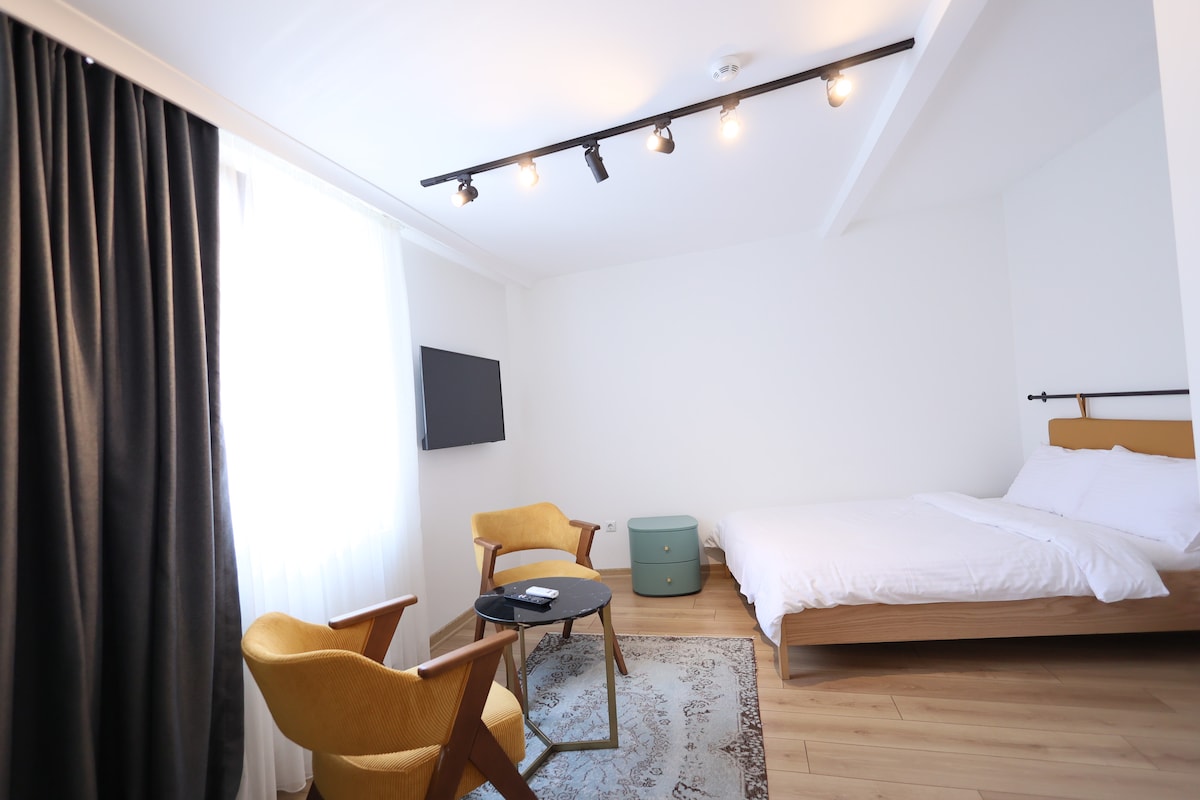 Nuestra habitación es lujosa, moderna y está cuidadosamente diseñada. Ubicada en nuestro hotel, esta habitación tiene una cama doble grande, un televisor inteligente de 43 pulgadas y un baño privado. Nuestra habitación tiene una pequeña cocina con una mininevera y pequeños utensilios de cocina. Nuestra habitación se encuentra en el tercer piso. Hay una cámara y un sistema de seguridad las 24 horas, los 7 días de la semana. La puerta exterior del edificio está especialmente codificada y protegida. Nuestra habitación está diseñada para alojar a 2 personas.