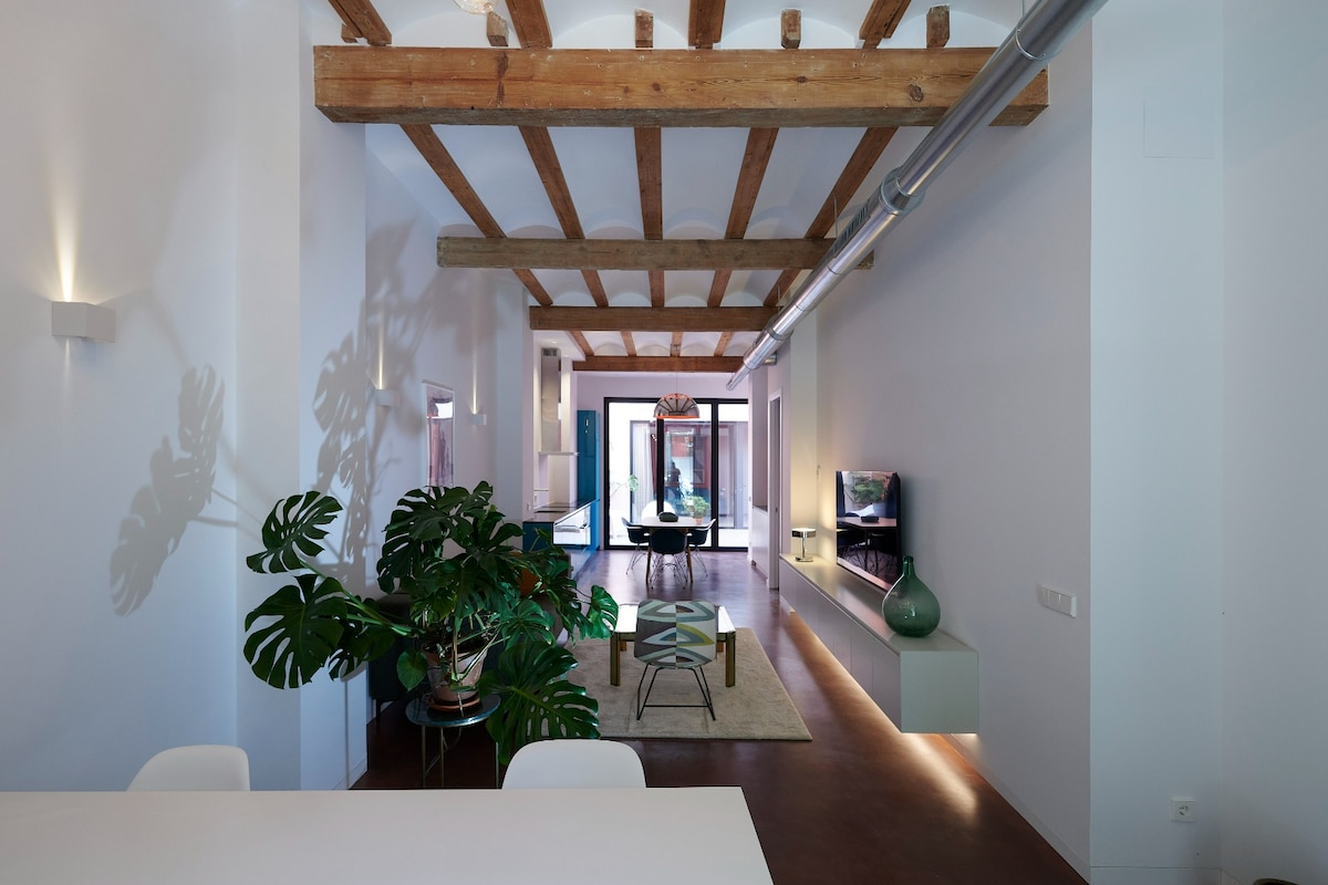 Elegante estudio de 56 m2 con cama tamaño queen y patio de 25 m2, perfecto para una persona, dos amigos o una pareja. Ubicado en una zona tranquila pero céntrica. A 10 minutos a pie de Russafa, donde encontrarás todos los cafés, tiendas y bares de moda. A 2 minutos a pie de los Jardines del Turia, donde podrás admirar los futuristas edificios de la Ciudad de las Artes y las Ciencias y caminar o recorrer en bicicleta los 9 km de espacio verde que rodea el casco antiguo. A unos 20 minutos a pie del casco antiguo. Fácil conexión en autobús a la playa.