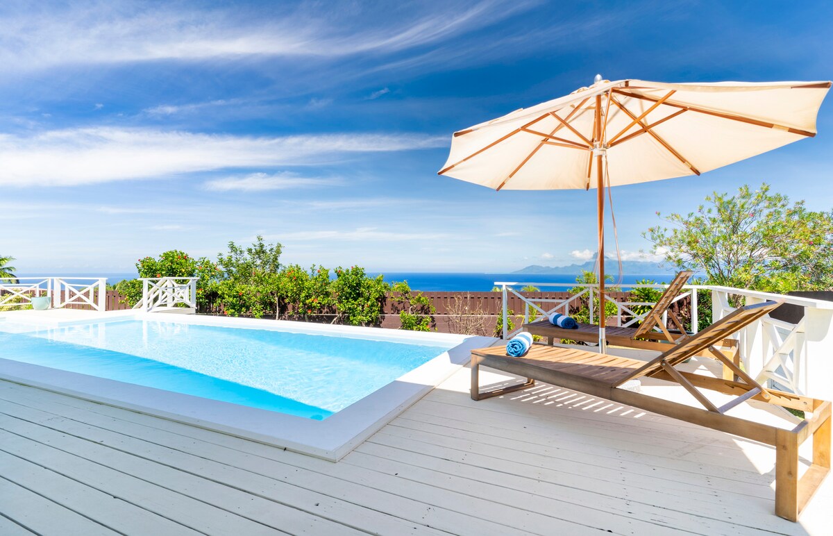 Relájese en esta casa de campo tropical, en la montaña, a 500 m sobre el nivel del mar, a 30 minutos del aeropuerto, con una vista única de Tahití sobre la laguna y Moorea, en una residencia muy tranquila 2 habitaciones con aire acondicionado, con 2 televisores, internet, para 5 personas con 2 camas king size y 1 cama individual o 1 king size y 3 camas individuales. Deck, piscina, barbacoa Cocina con lavavajillas, microondas, bar, horno, cocina de gas 1 baño, secador de pelo, lavar ropa+secadora de ropa, plancha