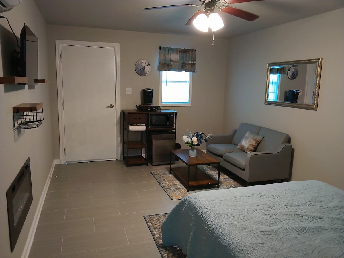 Después de un largo día de compras, ven a relajarte en este espacio recientemente renovado, a 3 millas de Trade Days. Es una unidad privada y no comparte nada con la casa principal. La entrada se abre a una gran habitación de estilo hotelero con aire acondicionado. La habitación tiene una cama de matrimonio y puede alojar a 2 huéspedes adicionales con 2 camas individuales plegables. Café, microondas, nevera, wifi y Smart TV de cortesía. Hay una sala de estar exterior para disfrutar de un café o una copa de vino al final del día.