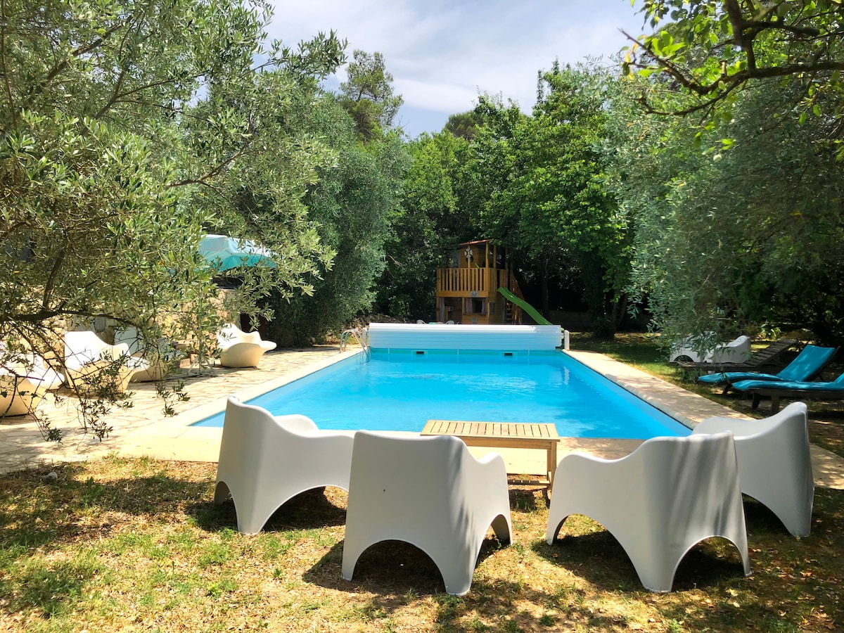 Casa insólita en el fondo del bosque. En la Provenza verde, entre bosques, olivos, garriga y viñedos. Fogata en invierno, piscina, pista de petanca, siesta, momento de meditación, yoga o lectura bajo la pagoda en el bosque. En plena naturaleza en un entorno excepcional. Cabaña con todas las comodidades y aire acondicionado, tranquila para recargar energías y desconectar. Aparcamiento. Valla para nuestros amigos los animales. Vacaciones ideales para visitar lugares magníficos.