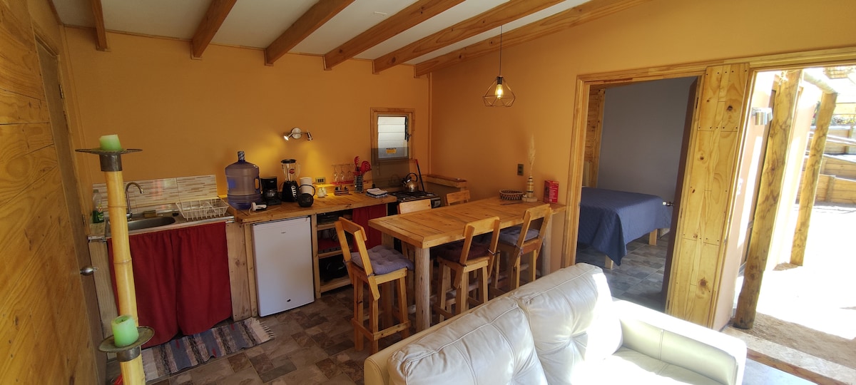 Es una cabaña situada en los pies de una montaña, con ventanas que permiten disfrutar de una hermosa vista al cerro Peralillo y el cielo estrellado en la noche. Si buscas un lugar tranquilo y disfrutas de la naturaleza este es el lugar indicado. Tenemos cerca muchas rutas para hacer expediciones y senderismo. Contamos con servicios de bicicletas. * Las cabañas no cuentan con wifi, pero podemos compartir en casos puntuales.