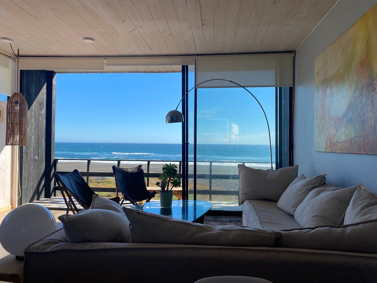 Bienvenido a Playa Lobos! 3 acogedoras casas con servicios en primera línea frente al mar. Disfruta Casa Topocalma con su hot tub y bosca. Tiene dos piezas y dos baños en 105m2 de superficie interior. La pieza principal en suite con cama king y la otra pieza con cama king más un camarote. Servicio mucama con reserva de mínimo de 3 noches. Durante estadías largas, se ofrece el servicio día por medio. Una mascota, raza chica/mediana, bienvenida. ¡Te esperamos!