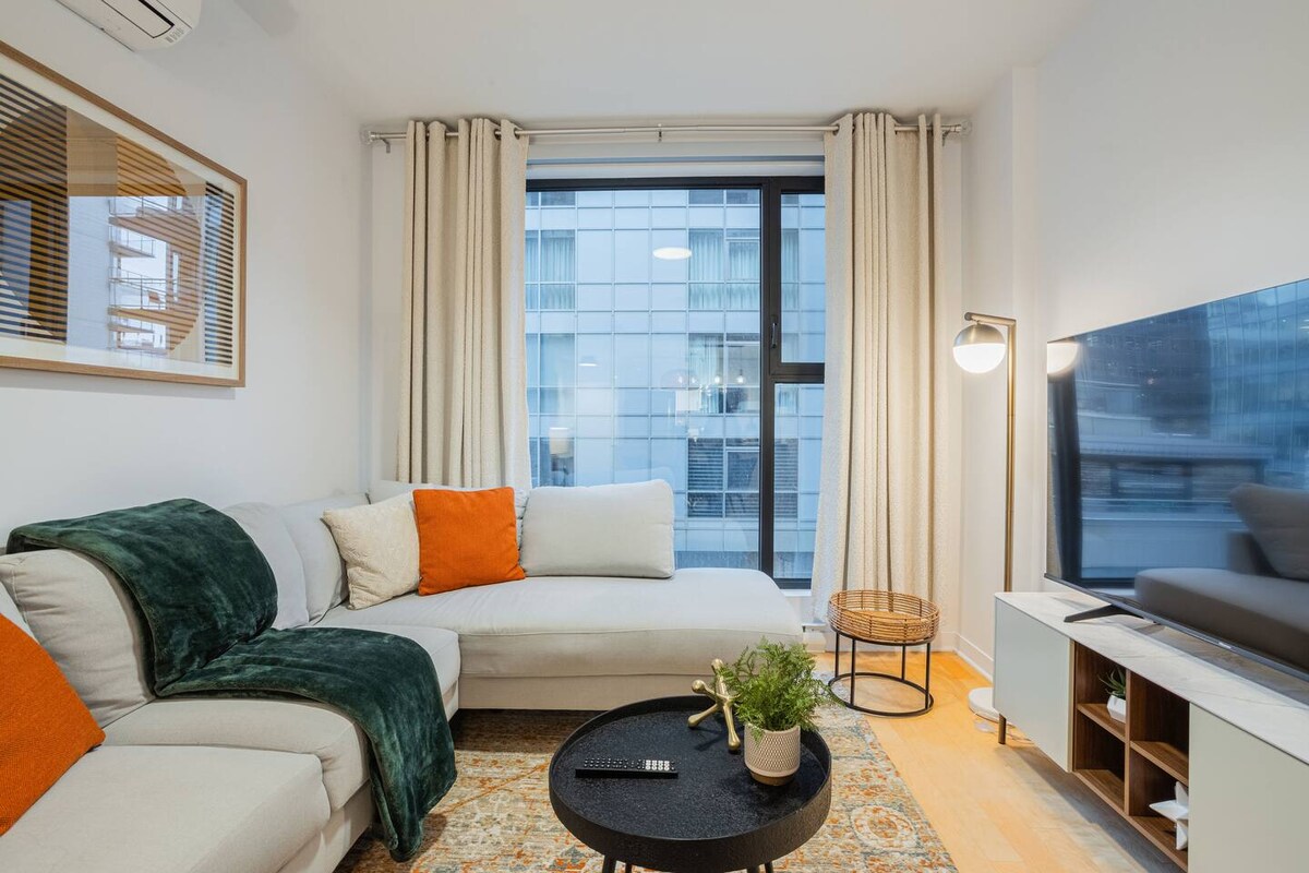 ¡Apartamento situado en pleno centro de la ciudad con acceso directo al Bell Center! Disfruta de tu estancia con lujo y comodidad en un apartamento de un dormitorio totalmente amueblado que incluye café, tostadora, hervidor de agua y todos los utensilios de cocina gratuitos. ¡Sauna, piscina, gimnasio con numerosas pesas y máquinas, salón panorámico, sala de juegos, salón y terraza con múltiples barbacoas a tu disposición! ¡Disfruta de un aparcamiento subterráneo gratuito y de un acceso a 1 minuto al sistema de metro sin tener que poner un pie fuera! Netflix incluido.