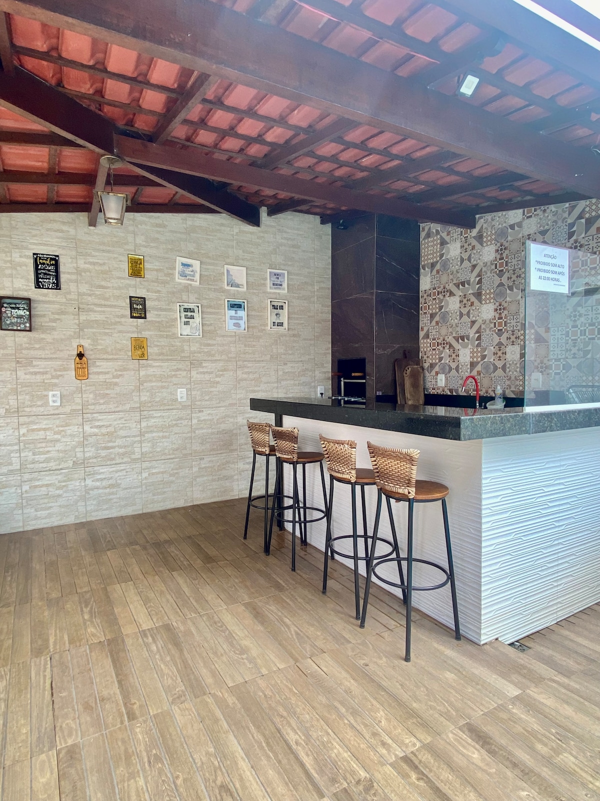 Casa pé na areia na Barra do Jucu, Vila Velha–ES, estilo único, acogedora y sofisticada. Arquitectura de tipo cabaña con jardín ornamental, redarium, ducha exterior y piscina con solárium y mobiliario. Zona gourmet completa, ideal para preparar moqueca capixaba, con parrilla y opción de fogata en el suelo para los días fríos. Junto al comercio local, a Praia da Concha (mar en calma para los niños) y a pocos minutos de Guarapari, Barra do Jucu es famosa por mantener la tradición del carnaval callejero (Congo).