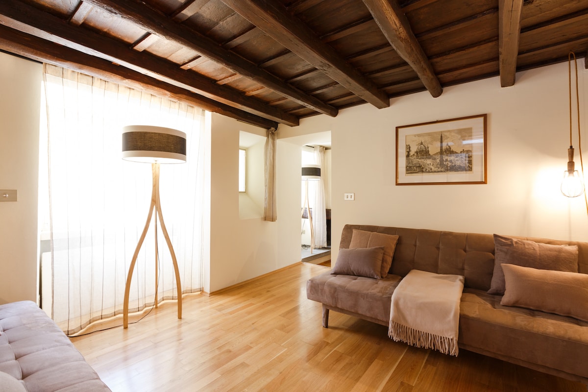 In the famous street , via Coronari,one of the world’s 10 most beautiful street according to the influential US publication Architectural Digest. 2 min from Piazza Navona, 5 min from Pantheon and S. Peter. Recently Renovated while keeping intact the original features. It can accommodate 4 people. New air conditioning. A bedroom with a new king size bed. A living room with two single sofà bed, a dining room with large table, full equipped kitchen and a new bathroom.The ideal location for family.