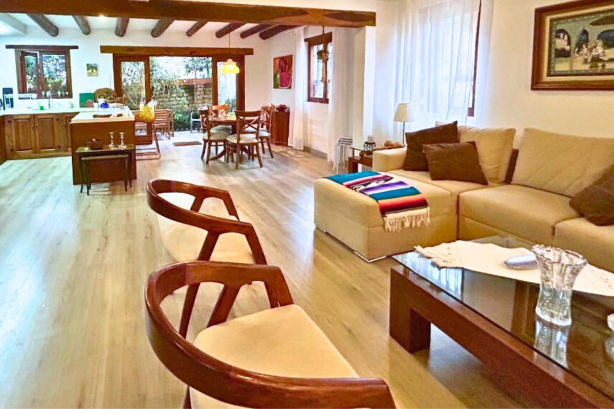 Experience charm and comfort in our home, crafted from natural materials, just outside Villa de Leyva. Enjoy the tranquil garden or take a stroll to town. Explore the nearby natural reserve, or unwind by the fireplace with a book. Reliable Wi-Fi is available if you need to stay connected—or choose to fully disconnect. The perfect mix of comfort and nature! Note: As the house is surrounded by nature, you may come across harmless seasonal crawling bugs.