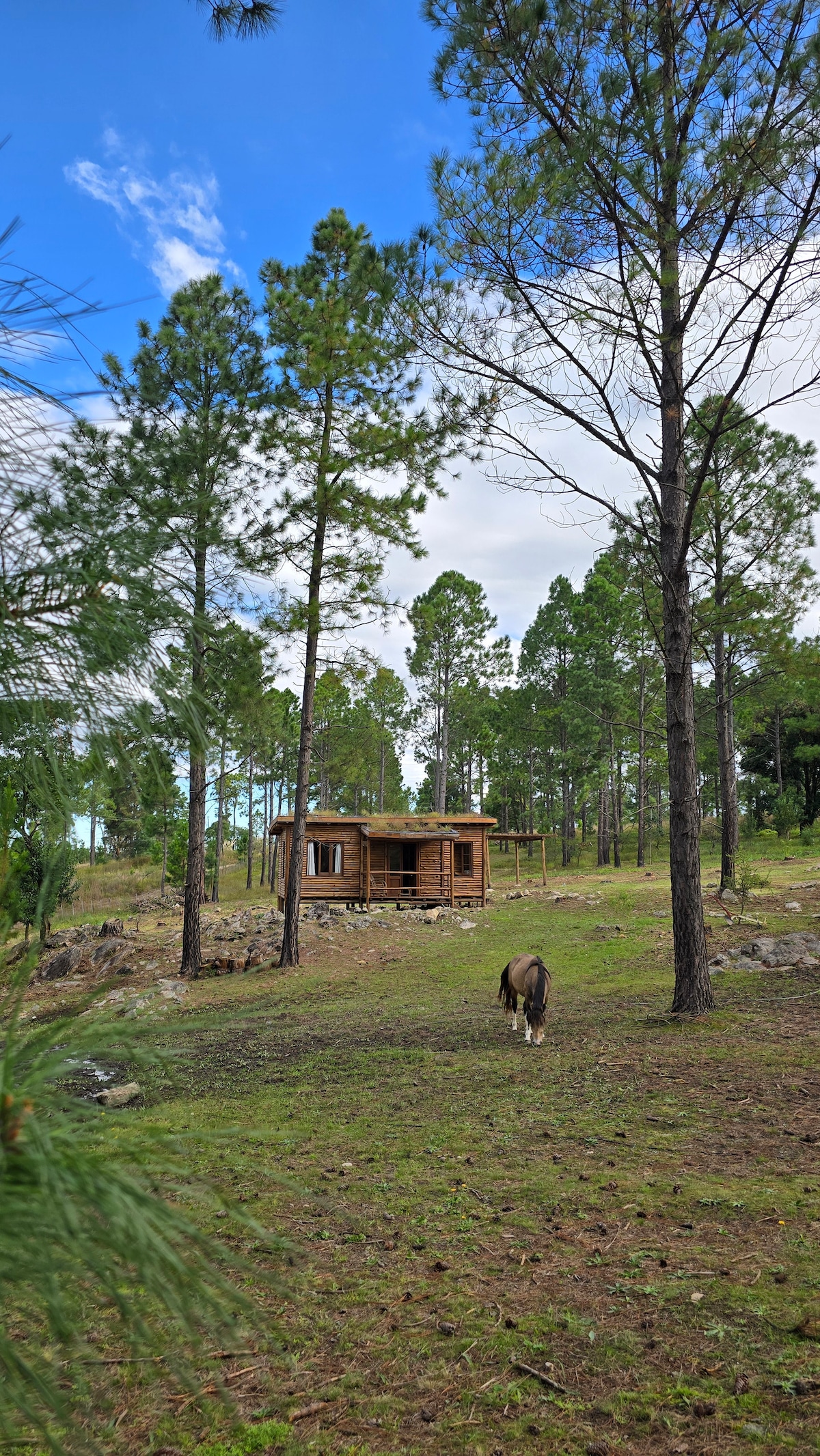 Cabaña ambientada con estilo nórdico, de troncos con techo vivo, inmersa en un bosque de pinos, en hectáreas de vegetación autóctona, senderos para caminatas y arroyos, donde lo único que se escucha son los pájaros y el silencio…