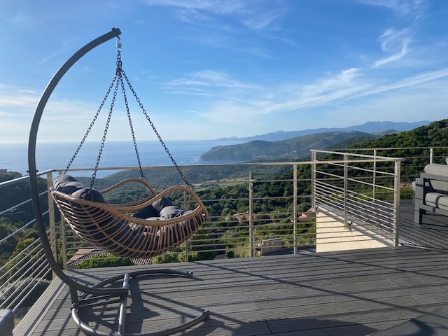 Encanto y Serenidad en un panorama excepcional Descubrirá desde una terraza de ipé de 80 m2, con vistas panorámicas al mar y al maquis. Tomará sus desayunos y comidas y disfrutará de su piscina de las maravillosas puestas de sol sobre el mar Córcega y tomará el aperitivo en un salón que domina el valle siempre frente al mar. Se puede descubrir las especies endémicas del maquis y disfrutar de lugares sombreados inspiradores tranquilidad y descanso.
