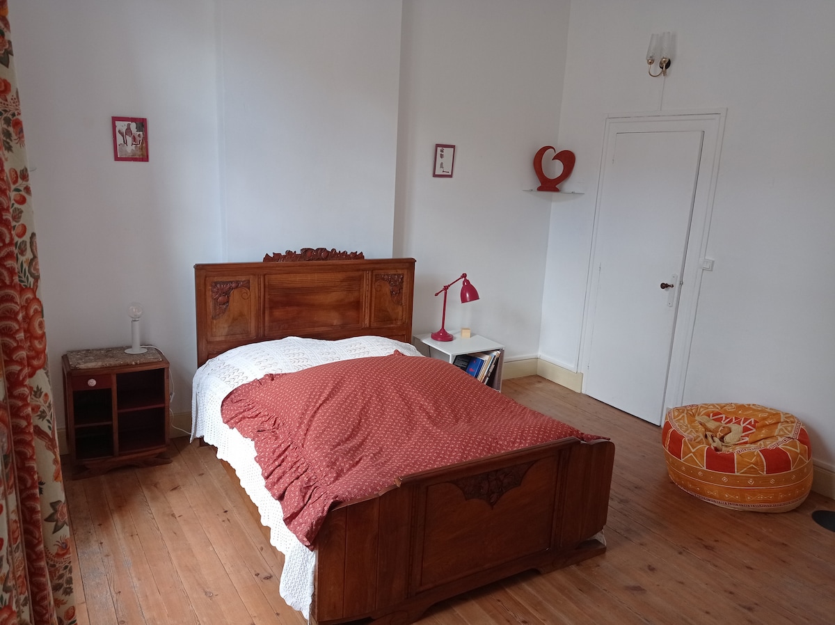 Situado en el centro de la ciudad de Villeneuve-sur-Lot y a 2 minutos a pie de todos los servicios. Encontrará la tranquilidad de una zona residencial con facilidad para aparcar de forma gratuita. Habitación de huéspedes totalmente equipada para solteros o parejas con acceso al jardín. La habitación de huéspedes incluye una cama doble con televisión, una pequeña zona de comedor y un amplio cuarto de baño con ducha, lavabo e inodoro.