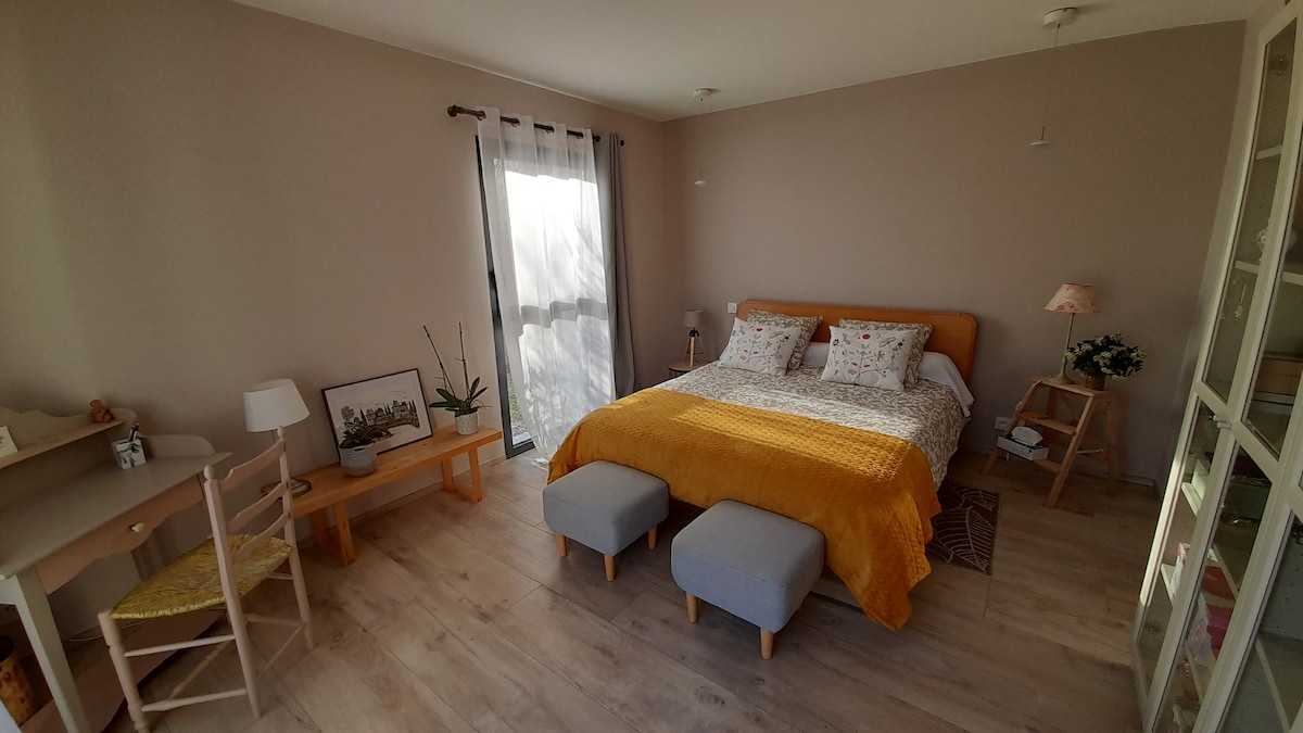 Bienvenue à L'atelier d'André chambre d'hôtes indépendante rénovée sur notre propriété .Chambre de 36m2 avec lit queen size 160x200 .Salle de bain avec douche et lavabo .Wc indépendant . Cafetière Tassimo ,mini frigo et micro ondes . Terrasse extérieure privée .Petit déjeuner compris et possibilité de repas en table d'hôtes(Végé possibles) . Séance de jacuzzi privée possible avec supplément . Possibilité de massages par prestataire professionnel sur réservation. N'hésitez pas à demander