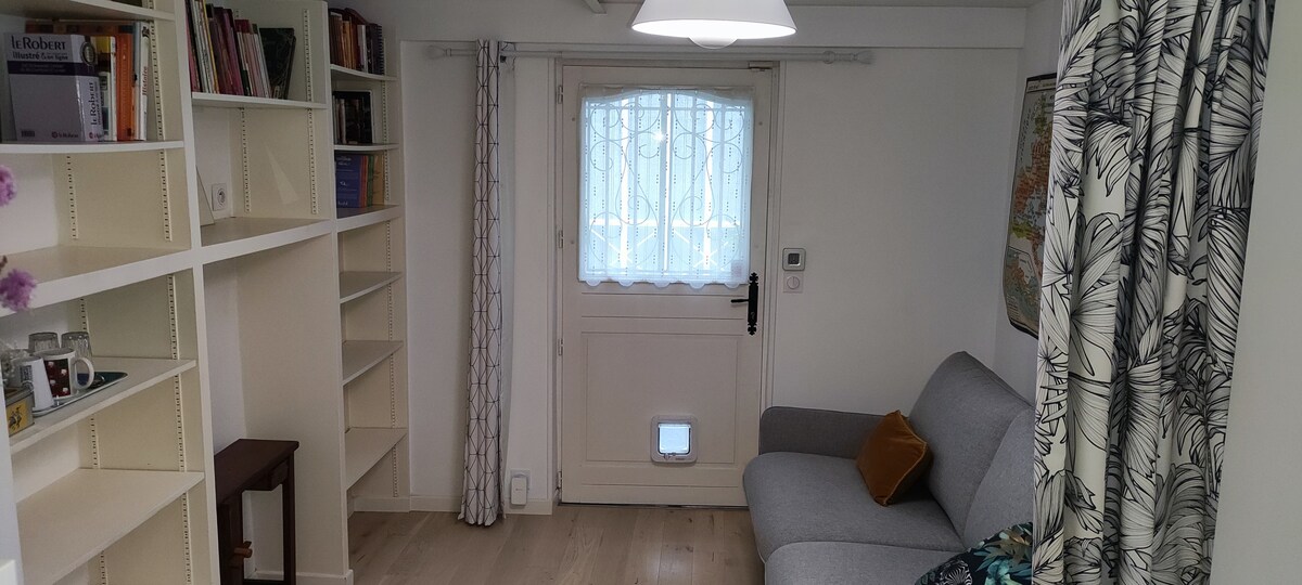 Una vivienda unifamiliar en el centro de la ciudad, solo para ti. El salón muy acogedor da a una calle tranquila. Su cocina totalmente equipada tiene capacidad para seis personas. El primer dormitorio bajo techo está equipado con una cama doble grande (160 cm). El pequeño dormitorio abuhardillado tiene una cama individual (90 cm). El sótano, bien calentado en invierno y naturalmente fresco en verano, es el refugio ideal (cama de 140 cm).