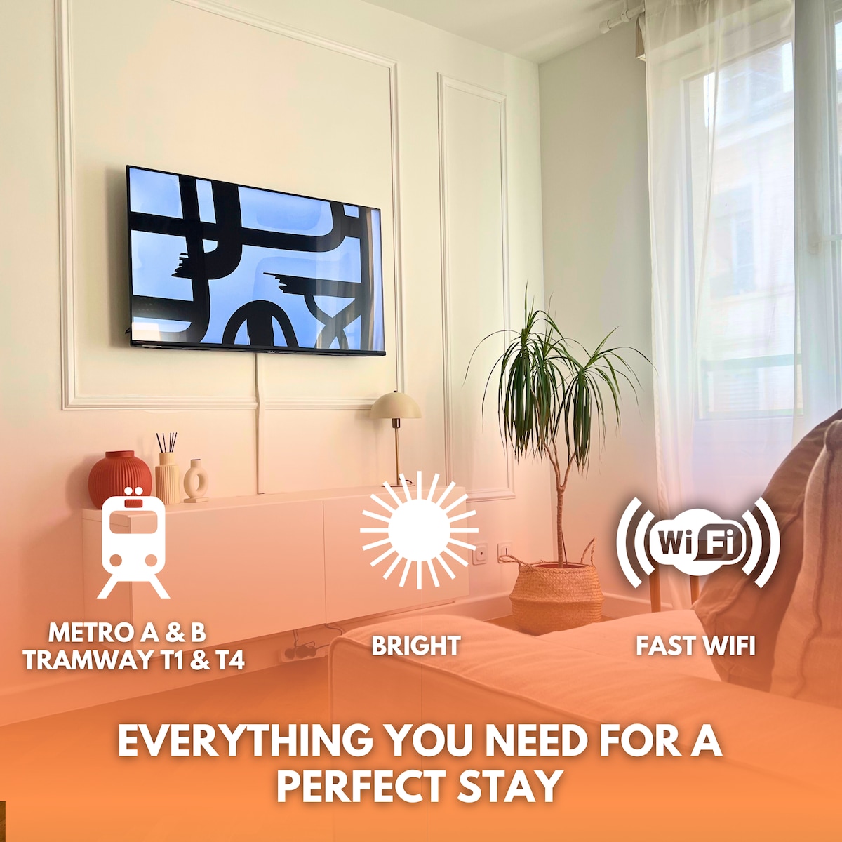 Appartement 60m2, 5ème étage ascenseur avec vue sur Lyon, entièrement rénové et climatisé, 2 chambres, 2 lits 160x 200, matelas Emma, salle de bain, wc indépendant, machine à laver, cuisine équipée, machine à café automatique grains, bouilloire, four, micro-ondes, lave-vaisselle, wifi, smart tv, enceinte connectée, 2 balcons, 1 place de parking privé sécurisée, magasins Intermarché ouvert 7/7, logement à 2 min à pieds du tram T3 ligne directe Parc OL/Gare de La part Dieu, aux portes de Lyon.