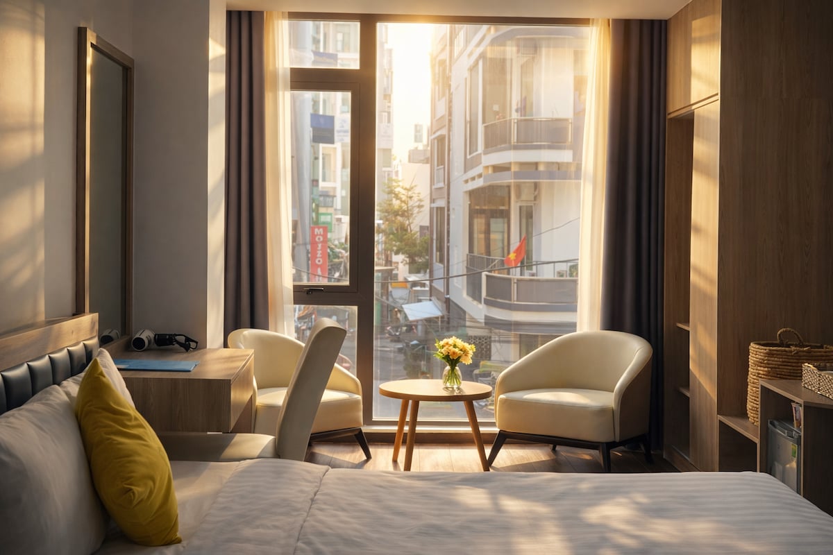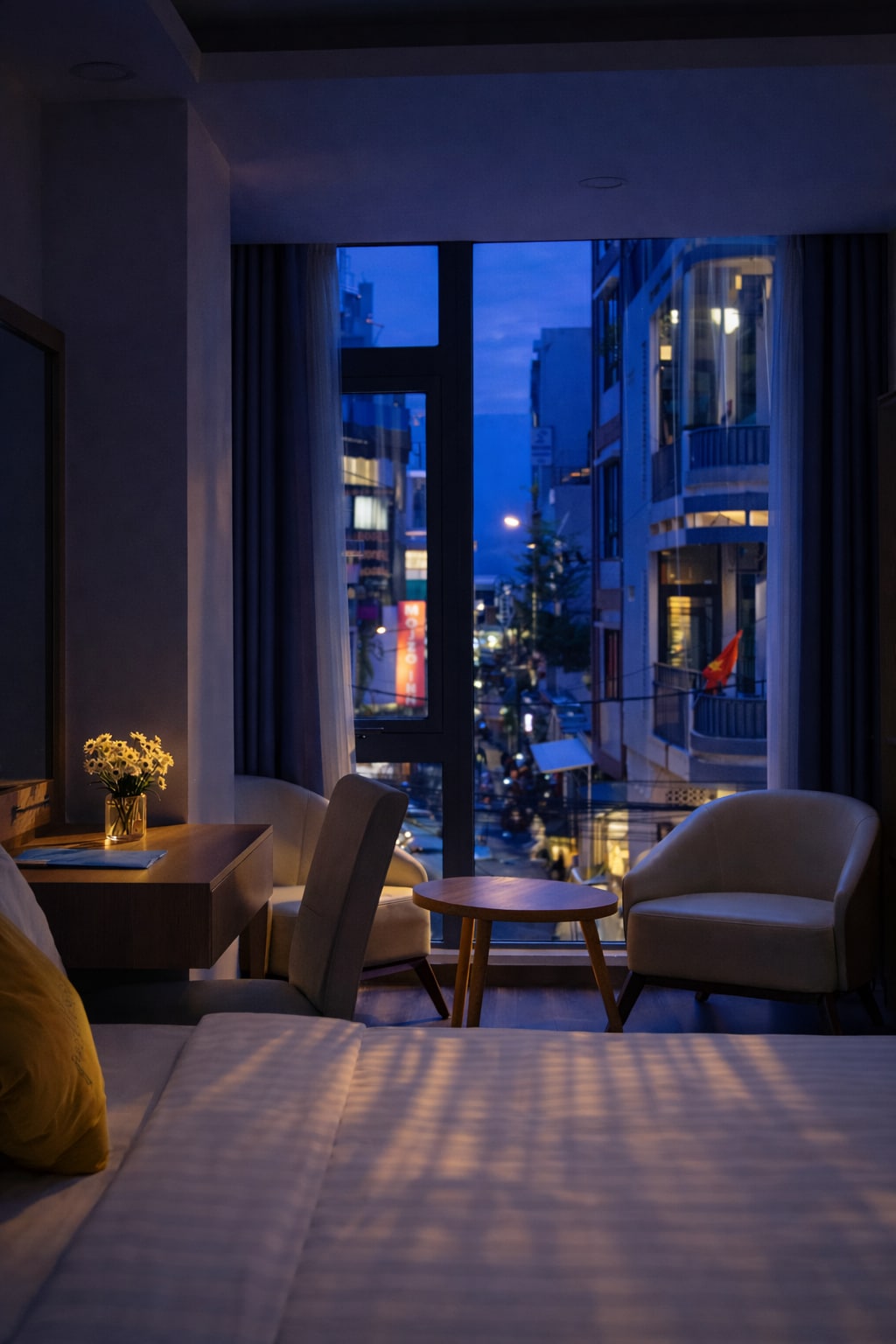 ¡DESCUENTO del 20% frente a nuestro hotel, la playa y el mar son increíbles! Tendrás un viaje memorable en Nha Trang. Esta habitación tiene una bonita vista a la ciudad y está totalmente amueblada para 2 personas. Nos aseguramos de que esté fresco y limpio. - 1 cama doble - La cama es muy cómoda. - Ventana y mucha luz natural - Baño privado y lleno de esenciales - Ascensor, aire acondicionado, nevera, hervidor de agua, wifi rápido, TV, mesa, silla, secador de pelo. - SERVICIO GRATUITO DE limpieza Y estacionamiento - El recepcionista trabaja las 24 horas, los 7 días de #Agregar: calle Pham Van Dong