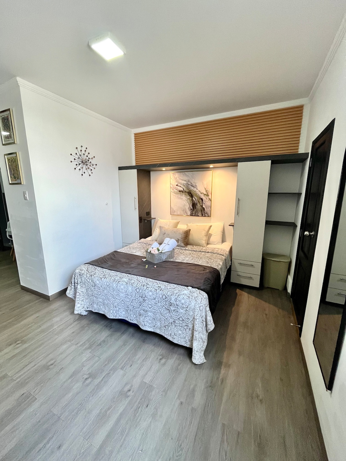 Suite de lujo ubicada en segundo piso alto(se sube escaleras). La ciudadela es privada y cuenta con guardiana 24/7. Junto a C.C. San Marino. Posee sala, cocina, dormitorio, baño privado, TV smart con Netflix, wifi, refrigeradora, estacionamiento. El acceso a la urbanización es controlado y hacemos lo posible para agilitar el proceso a nuestros huéspedes; no obstante, puede que tome unos minutos adicionales de espera.