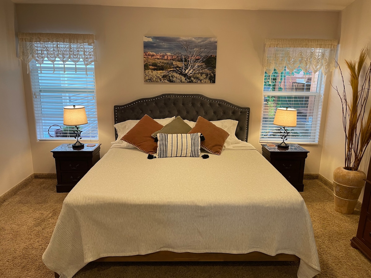 Te alojarás en una casita que forma parte de esta casa construida a medida con todas las comodidades, entrada privada y garaje para 2 coches con entrada con teclado. TV/Chromecast, ¡acceso rápido a Internet de fibra óptica de 1 gig! El patio trasero tiene una barbacoa, mesas de patio y chimenea. Estamos situados en la base de la meseta de Gooseberry, que tiene las mejores rutas de ciclismo de montaña/senderismo y es el hogar del Red Bull Rampage. Zion está a 40 minutos. Nuestros precios se mantienen bajos para que tu estancia sea inolvidable...