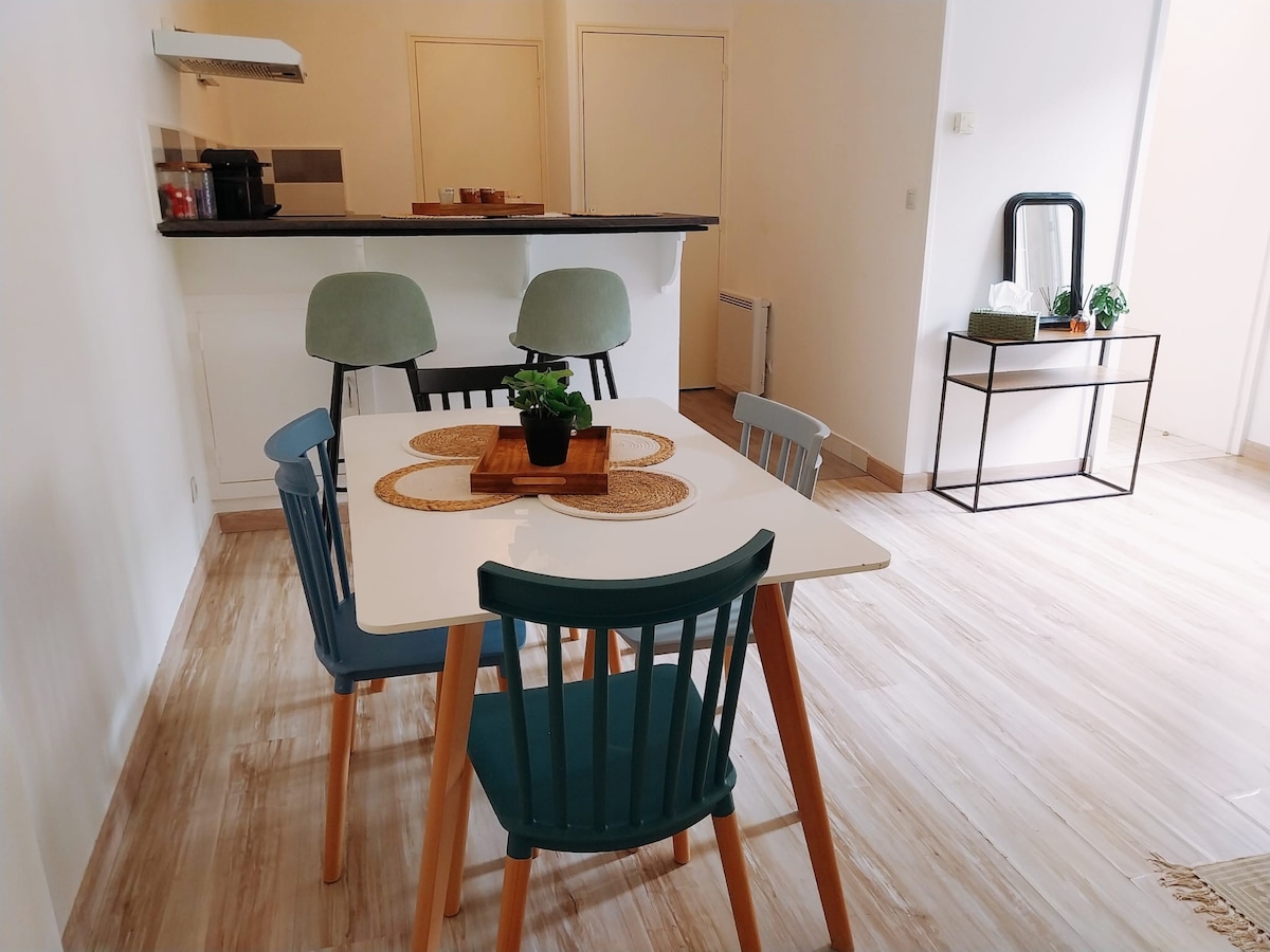 En plein cœur du centre ville avec ses commerces et à moins de 100m de l'office de tourisme. Logement en fond de cour dans une résidence privée et sécurisée par badge avec son entrée indépendante, sa terrasse et sa place de parking privée. Pour une nuit ou un long séjour, vous disposez d'une chambre avec lit 160×200 ( linge de lit fourni),WC séparé, salle de douche avec serviettes de bain et lave linge, cuisine équipée avec plaque induction, four, micro ondes, frigo et congélateur.