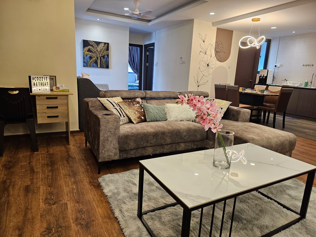 Estáis en vuestra casa. Nuestro apartamento se encuentra en Jazz Suites 1, justo encima de Vivacity Megamall. Podemos alojar cómodamente hasta 10 personas en este alojamiento, ya sea parejas, para vacaciones familiares o un viaje de negocios. Jazz Suites se encuentra cerca del aeropuerto (5 km), el centro médico Borneo (2 km), el centro de la ciudad (5 km), la Universidad de Swinburne (2 km) y Unimas (10 km). Es un lugar tranquilo y céntrico. **Tenemos otras unidades en el mismo edificio. Ponte en contacto con nosotros si necesitas más unidades cerca en un grupo grande**