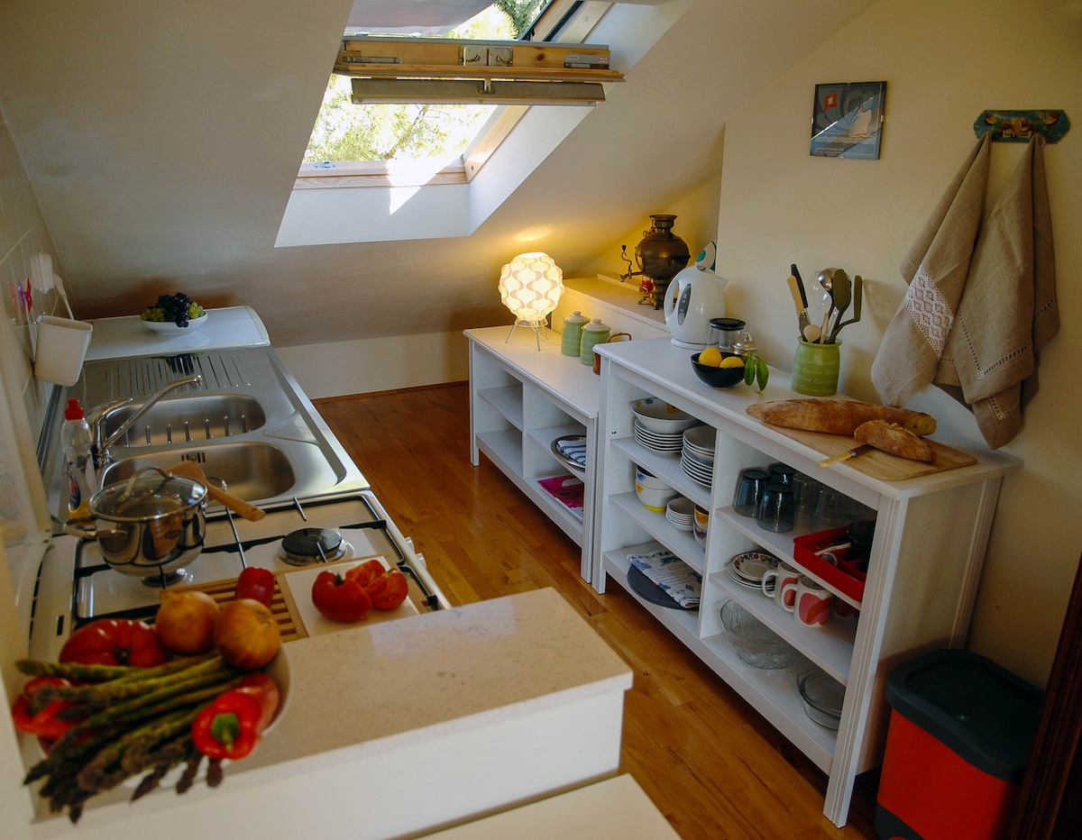 «Laganini» significa coloquialmente en Dalmacia: baja el ritmo, disfruta de la vida, relájate, olvídate del tiempo y de todas las obligaciones. Por eso te invitamos a nuestro loft en el ático, reformado con mucho gusto. En un total de 60 metros cuadrados, te espera un diseño bien pensado, un estilo de decoración moderno, mucho romanticismo y un toque de lujo, enmarcado por antiguos muros de piedra natural. Siéntate y disfruta de las vistas al mar, las montañas circundantes y los tejados del casco antiguo de Varoš.
