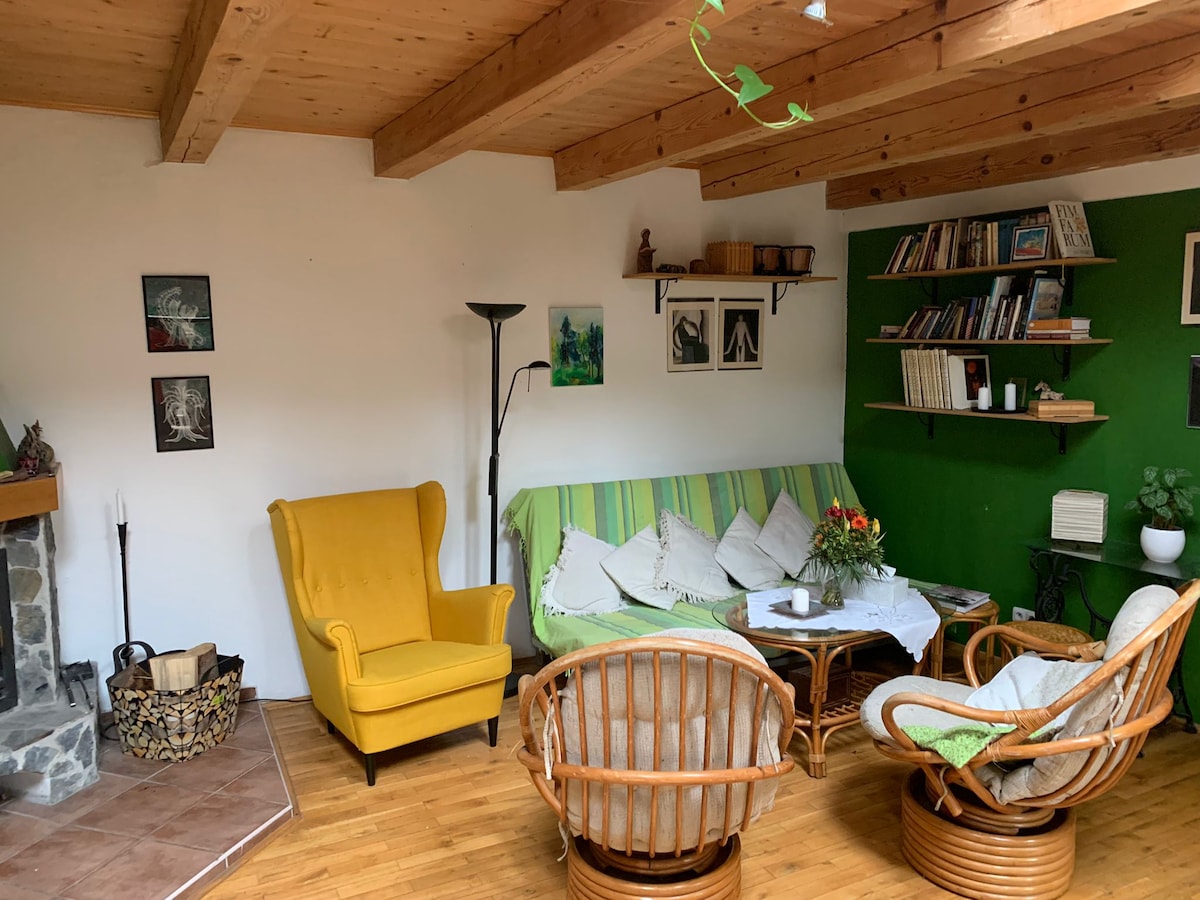 CASA DE CAMPO DEL CAPELLÁN Situada en las tierras altas de la Siberia Checa, la cabaña se encuentra en un gran jardín junto a la iglesia y el castillo. Es ideal para una escapada romántica en pareja, oficina en casa o residencia de escritor/ artista. El dormitorio de estilo loft está situado en una plataforma elevada sobre el baño. La cabaña tiene una cocina totalmente equipada, un sistema de calefacción central y también una estufa de leña. Ubicado en un pequeño pueblo de Neustupov, rodeado de una hermosa naturaleza, a 1 hora en auto desde Praga.