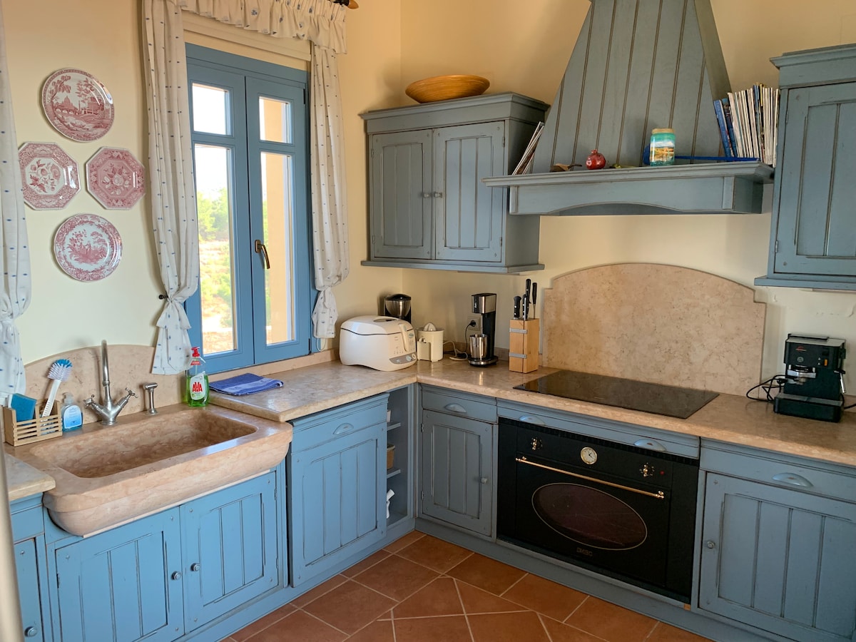 Ríndete a nuestro acogedor espacio terrenal y disfruta del poder inmersivo de una vista completa del horizonte del mar y el cielo. Todas nuestras villas cuentan con un jacuzzi privado al aire libre. Plaza de aparcamiento justo enfrente de la casa. La ciudad de Plomari está a 1 km.
