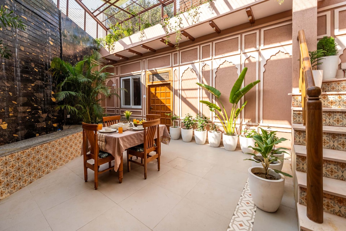 Vrindara Villa rises in the heart of Mathura like a quiet whisper of luxury—minimalist in spirit, yet rich with the soul of a royal haveli. Here, earthy textures meet clean lines, creating a home that feels both timeless and effortlessly chic. Its four serene bedrooms open into spaces that catch the golden glow of morning light, while the beautiful terrace becomes your private perch over the city’s skyline—perfect for sunrise chai or conversations that stretch into starlit silence.