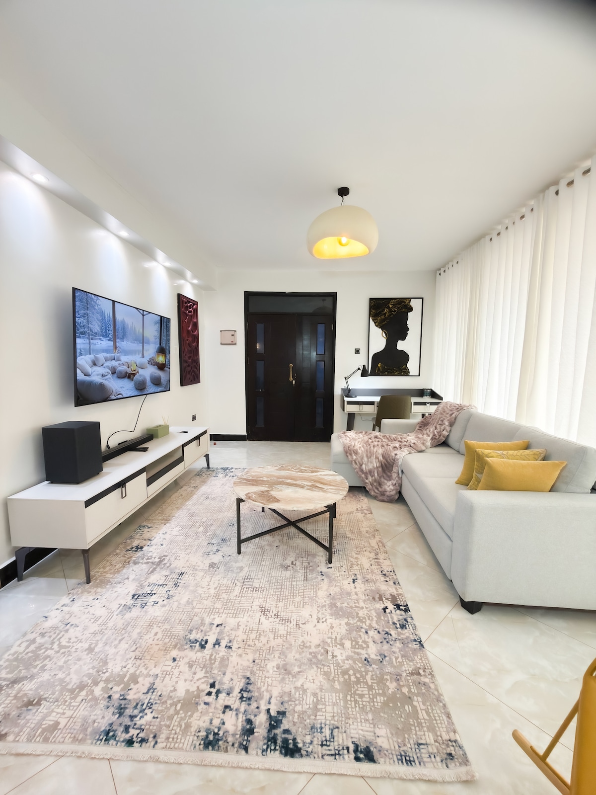 Este estético apartamento de un dormitorio se encuentra en Naalya Estate, cerca del supermercado Quality. Está a pocos minutos en coche de la conexión de la carretera de circunvalación norte que te lleva al aeropuerto a través de la autopista Express y cerca del centro comercial Acacia, con bonitos restaurantes y bares cerca. También hay varias rutas alternativas al centro de la ciudad. Los servicios son: - Todos los electrodomésticos de cocina, por ejemplo, arrocera, cafetera, licuadora - Wifi de alta velocidad. - Televisor inteligente Samsung de 55 pulgadas - Barra de sonido Samsung. -Lavadora