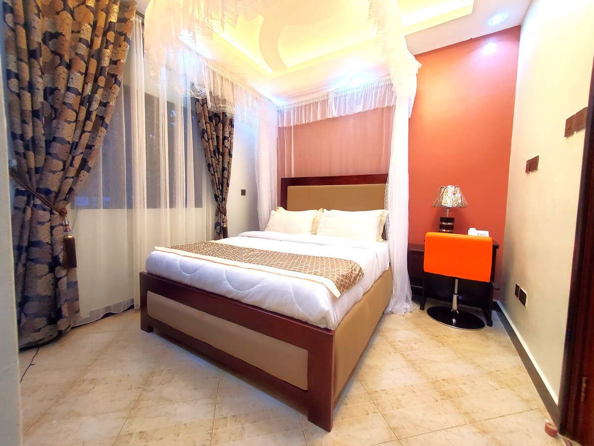 No detail is overlooked at our charming hotel in Bwebajja. The Budget Travelers Room offers comfort, style, and privacy with modern amenities like Wi-Fi, Cable TV, and air-conditioning — perfect for guests seeking affordable elegance and convenience.
