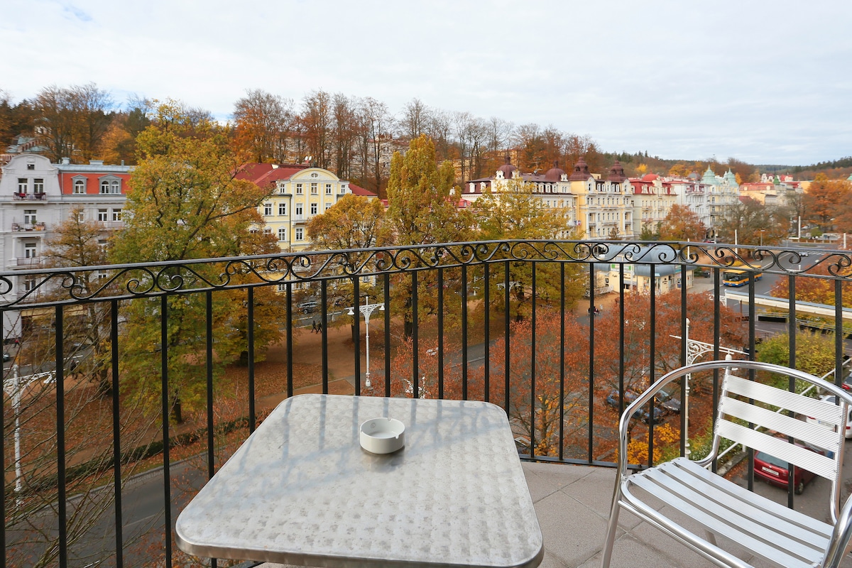 Experience Mariánské Lázně with 1,000+ reviews of guest trust. Perched in the heart of the historic spa district, this elegant residence offers a rare panoramic view of the town from your private balcony. Perfect for families, couples, or a romantic retreat, the stay blends modern comfort with immediate access to the Colonnade and Singing Fountain. Enjoy a top rated experience where every detail is designed for your relaxation. Your scenic spa getaway starts here.