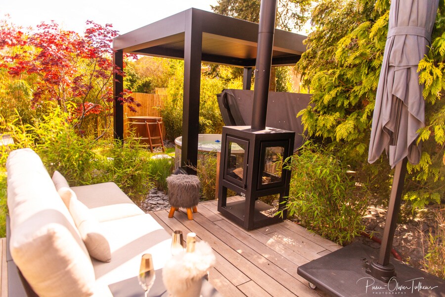 Bienvenido a nuestro Jardín Secreto en Waterloo. Un lugar único en el Brabante valón, cerca de Bruselas. Al empujar una puerta india de 250 años de Rajasthan, entras en otro mundo. Sauna de leña, baño noruego, jacuzzi bajo una pérgola estrellada, balneario... Tanto en verano como en invierno, todo invita a la reconexión. Se pueden pedir platos pequeños. Por la noche, las luces revelan el brillo de este Edén. La ropa de cama spa te espera bajo una nube luminosa sobre la cama de los enamorados.
