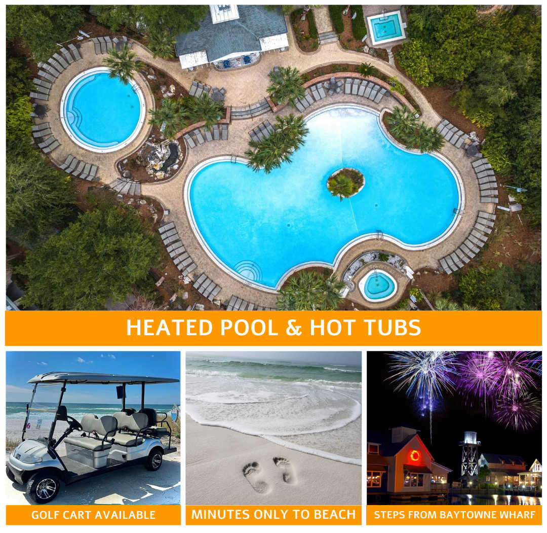 Enjoy the best of Sandestin at Baytowne Bliss, a 3BR/3BA Lasata condo just steps from Baytowne Wharf and Conference Center. Relax on 3 private balconies, cool off in the heated pool and hot tubs, golf cart or tram to the beach, and hang out at Baytowne with dining, entertainment, and FUN! Includes full kitchen, 2 king suites + double-queen suite with kitchenette, sleeper sofa, washer/dryer, and access to resort golf, pickleball, and dining. 6-seater golf cart available March 1 for an added fee.